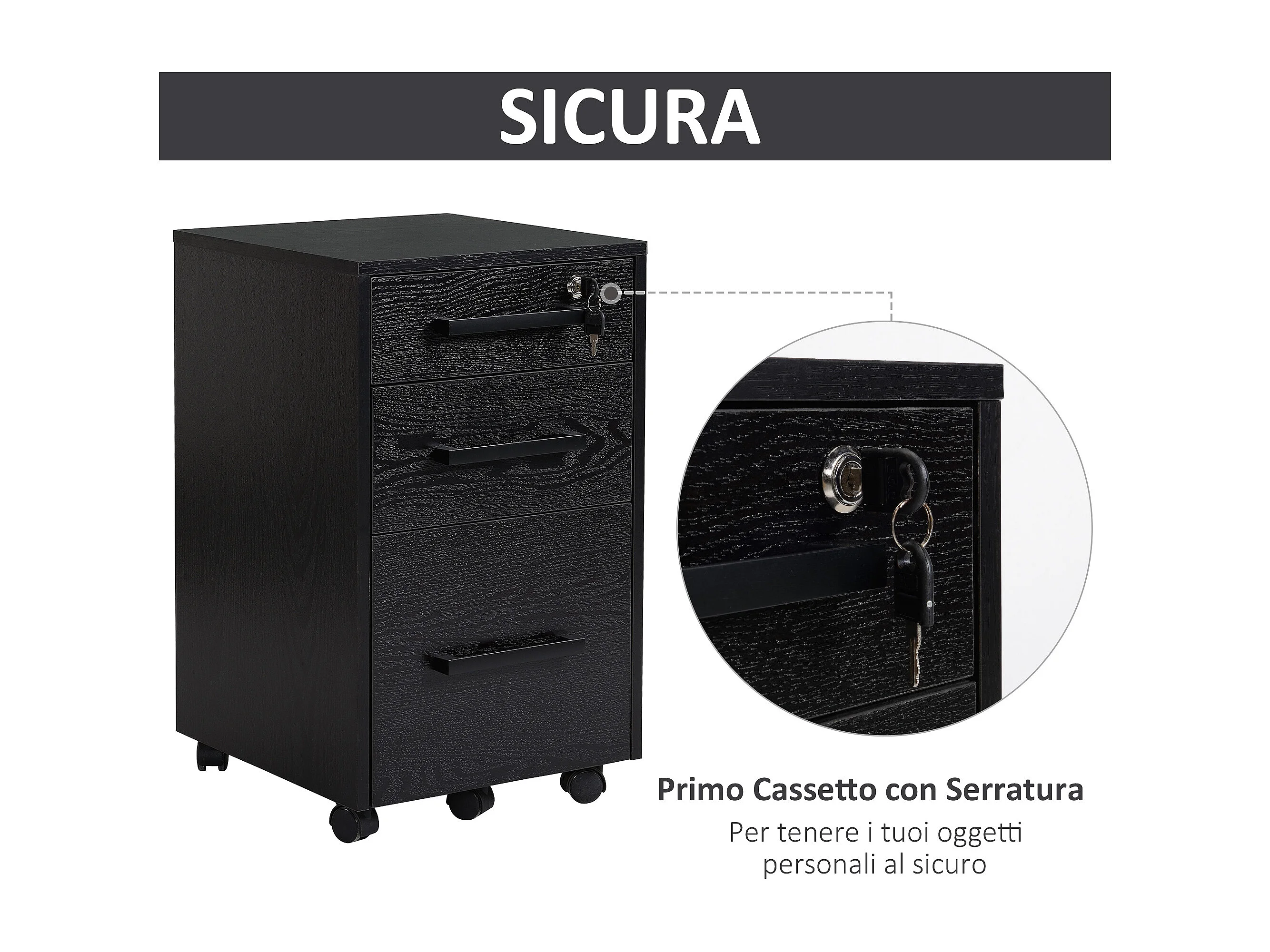 Cassettiera portadocumenti da ufficio a 3 cassetti con serratura nera