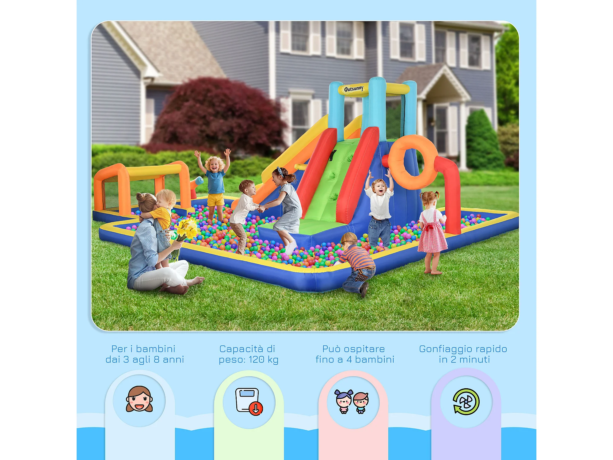 Castello gonfiabile bambini 3-8 anni con scivolo e porta multicolore