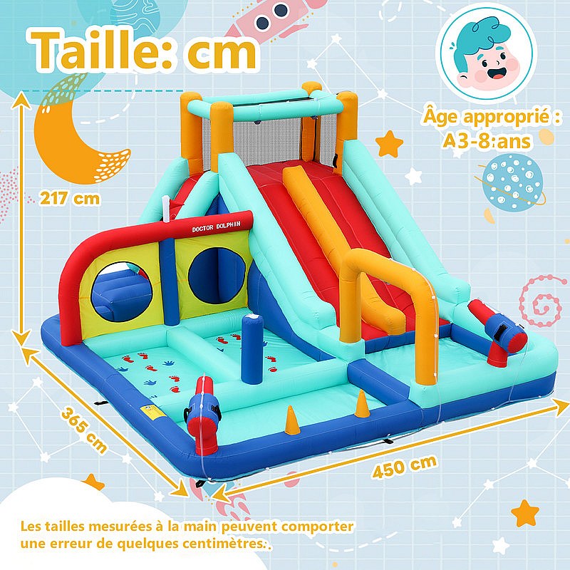 Castello gonfiabile, parco acquatico, con soffiatore, 2 scivoli e pistola ad acqua, 3-8 anni, 365x450x217cm