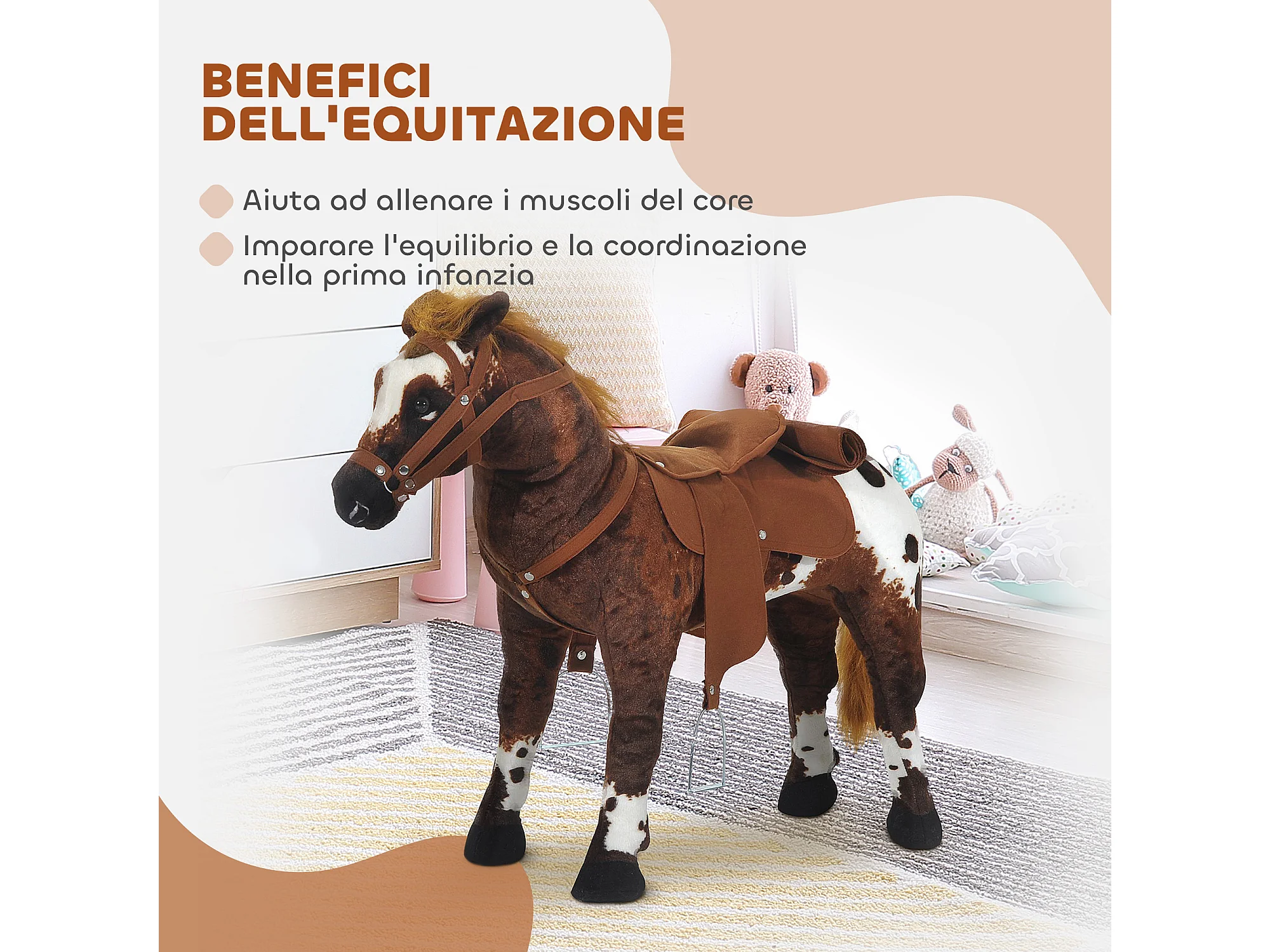 Cavallo a dondolo per bambini con nitrito, sella e staffe marrone