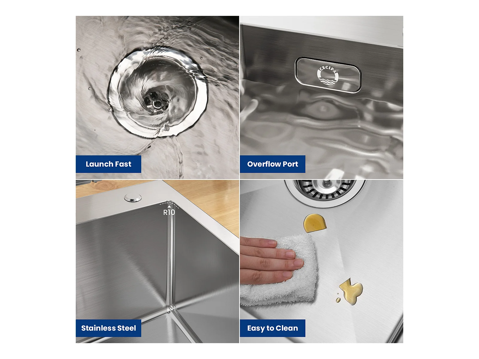 Lavello da Cucina Cecipa max 1 Vasca 40×45 cm Lavello in Acciaio Inox 304 Da Incasso o Filo Ad Almeno 40 cm dal Fondo del Mobile, Modello UE