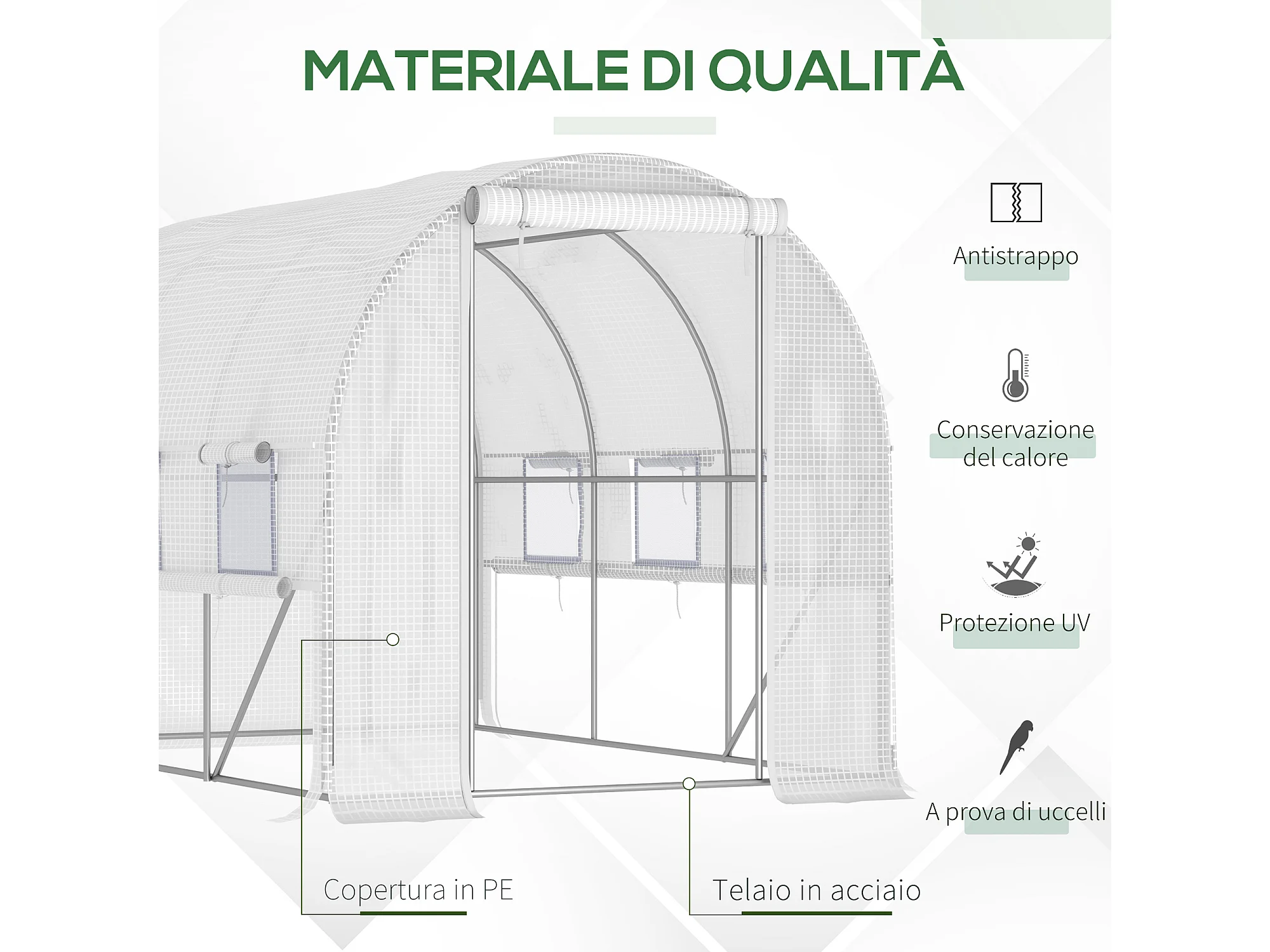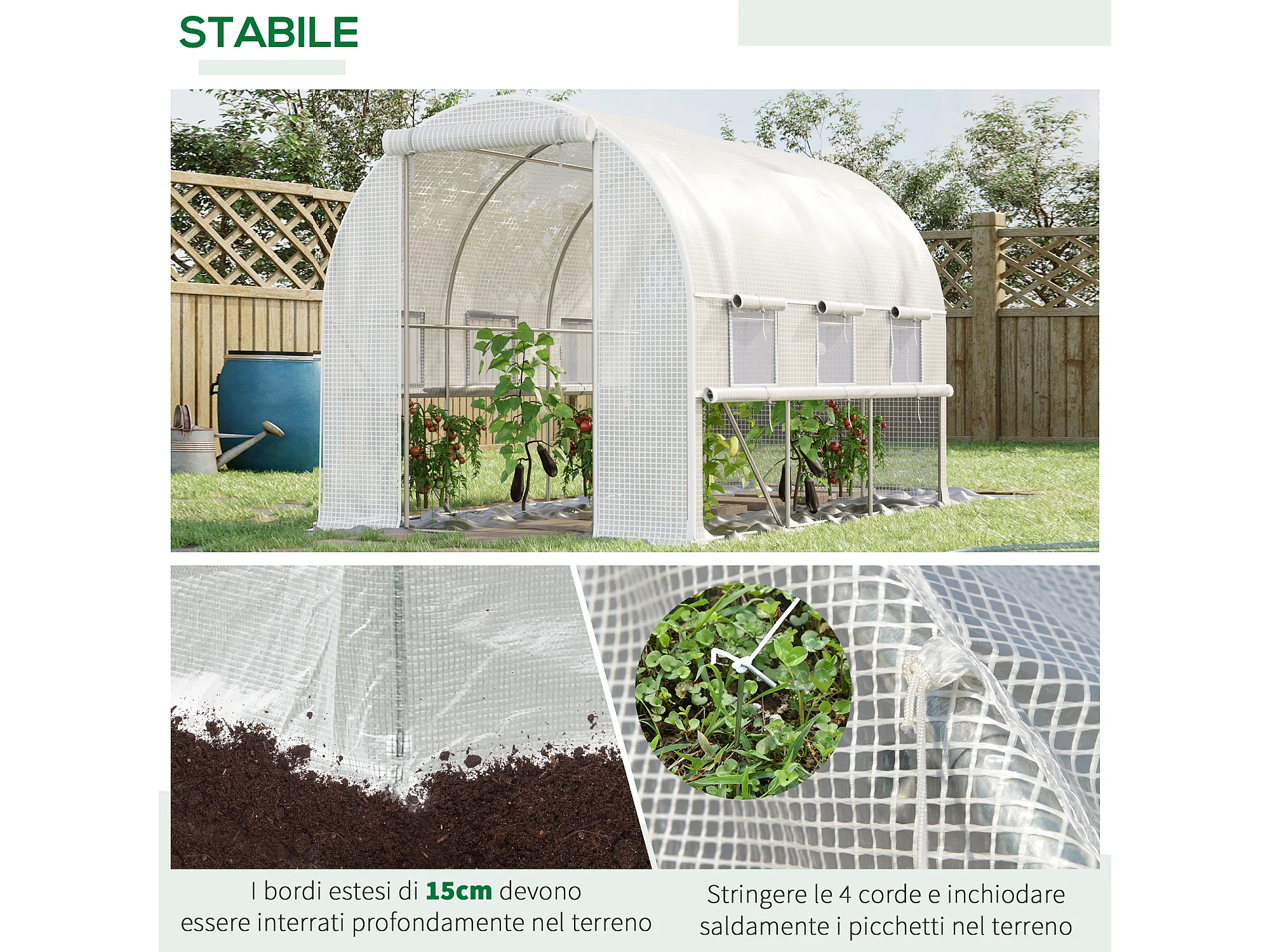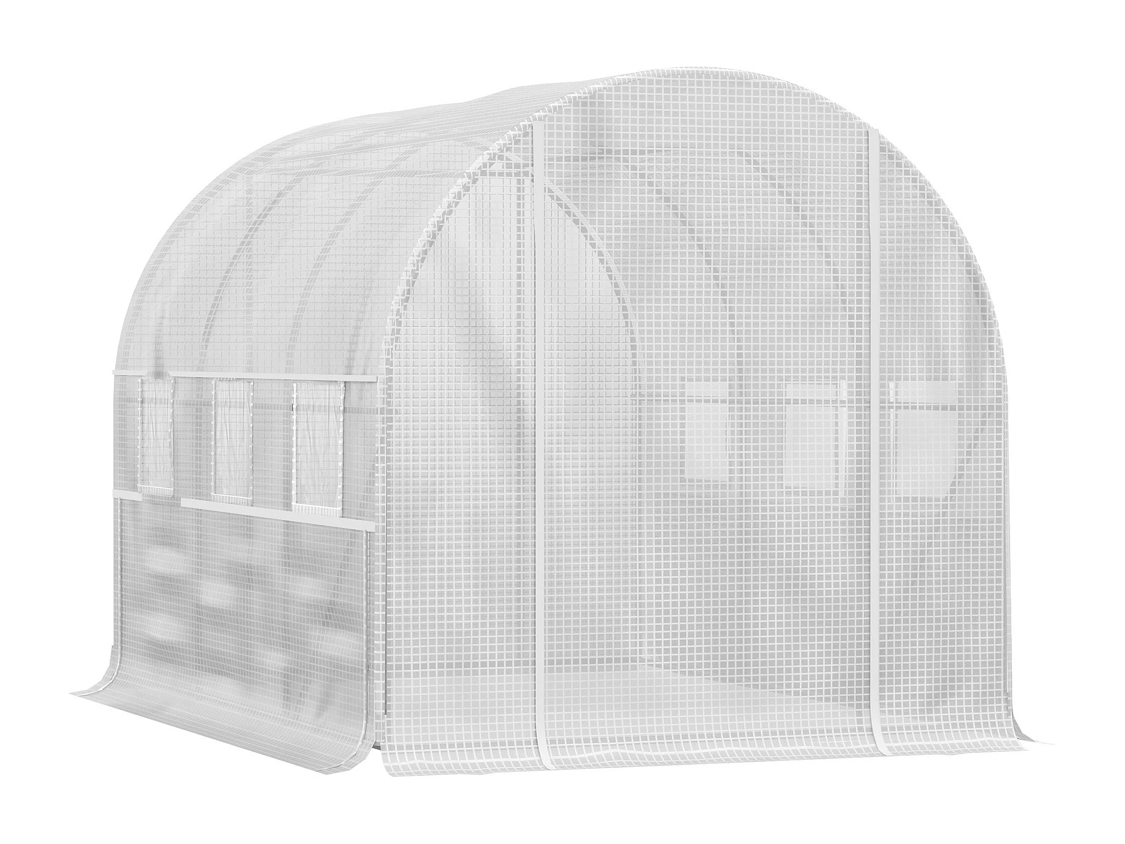 Serra a tunnel con 6 finestre a rete in metallo e pe 3.5x3 m bianca