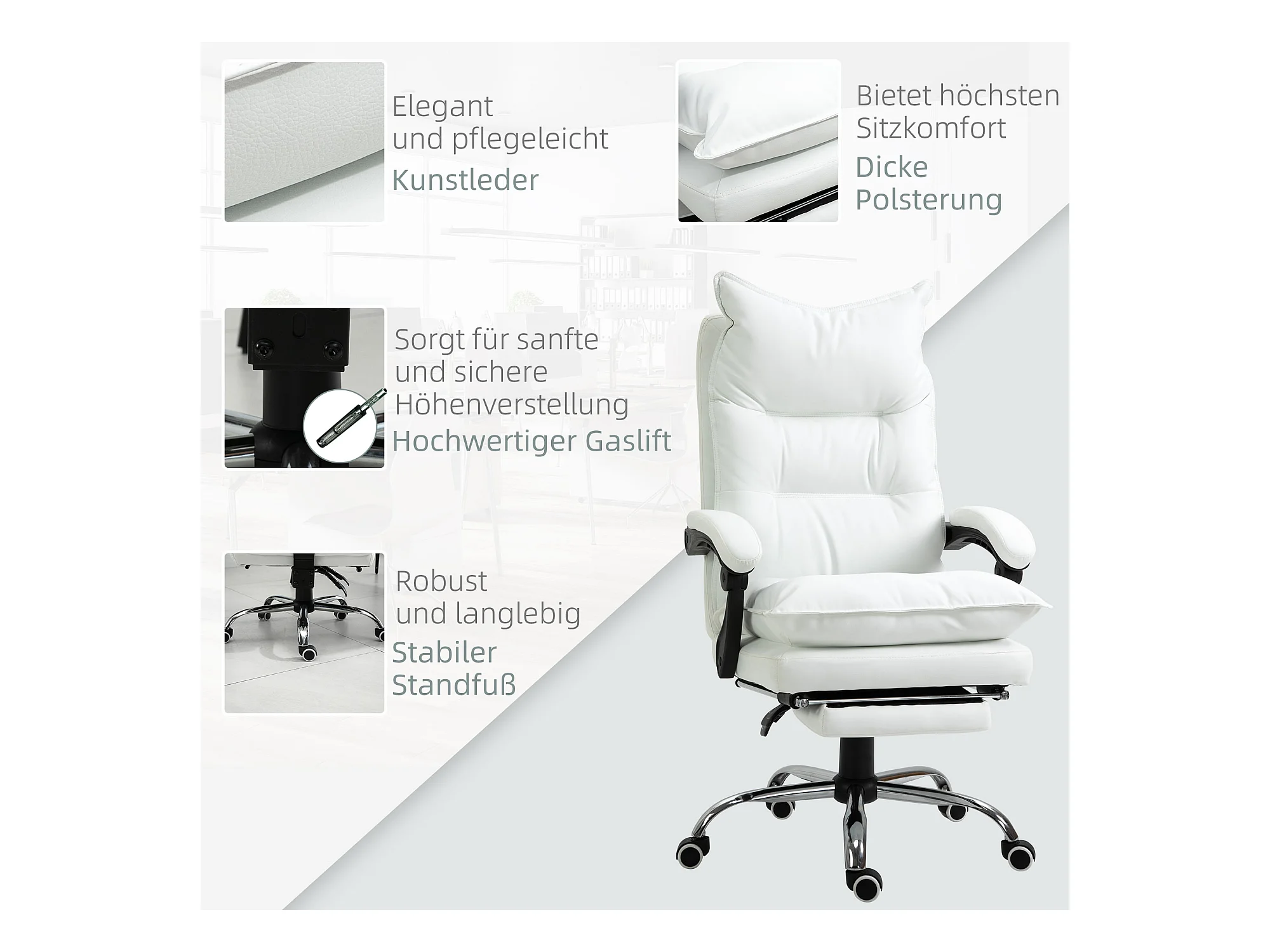 Chaise de Bureau inclinabile simile cuir avec repose-pieds réglable blanche 135kg