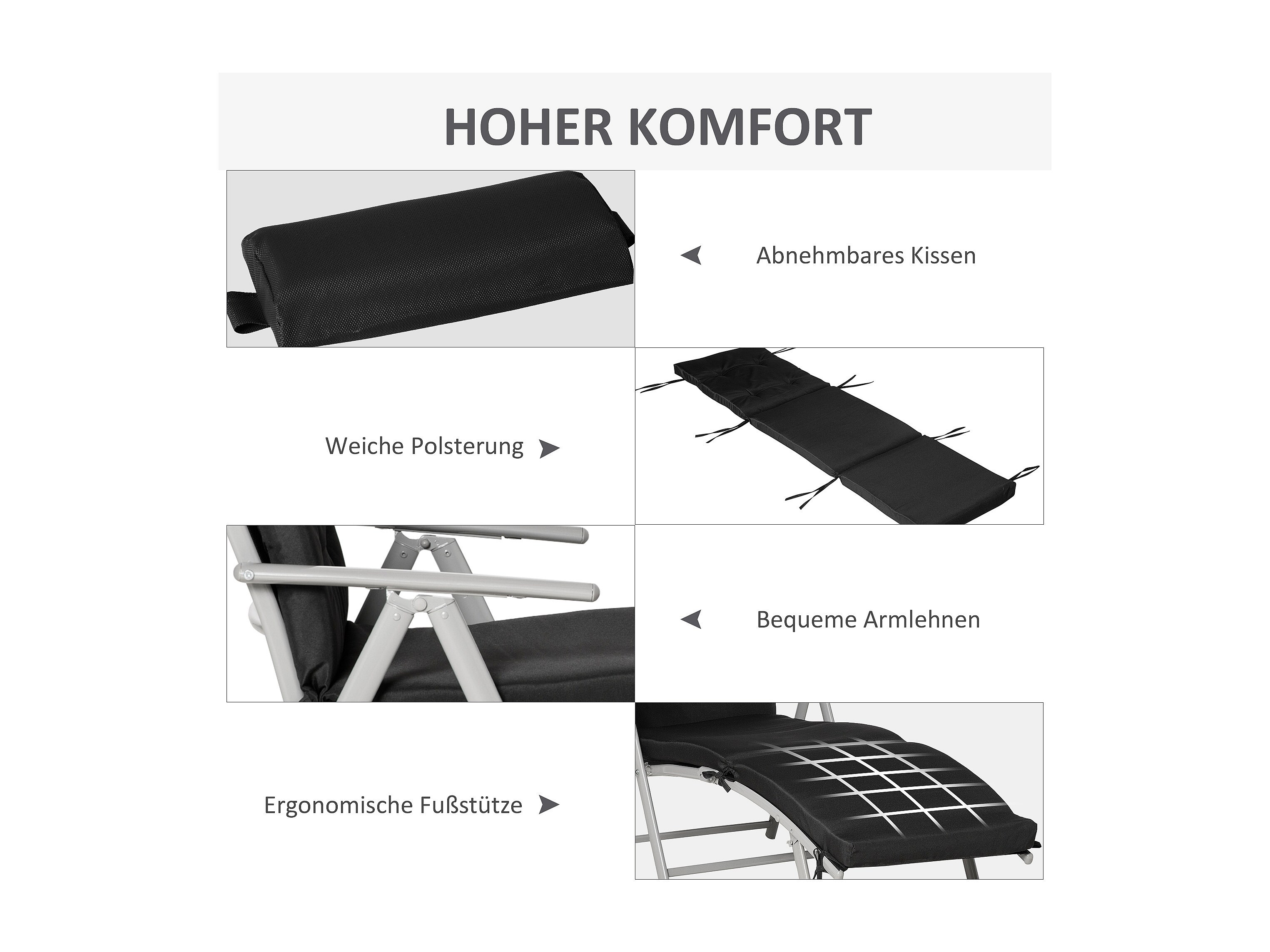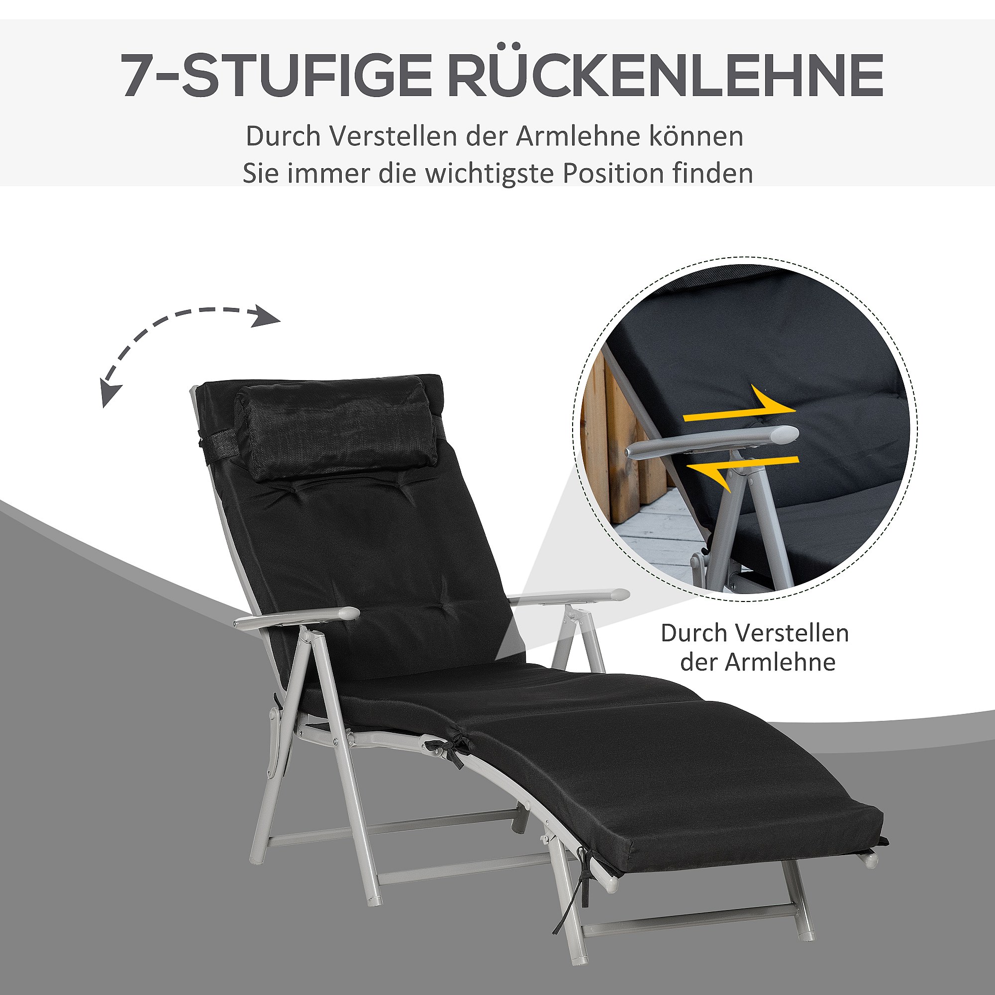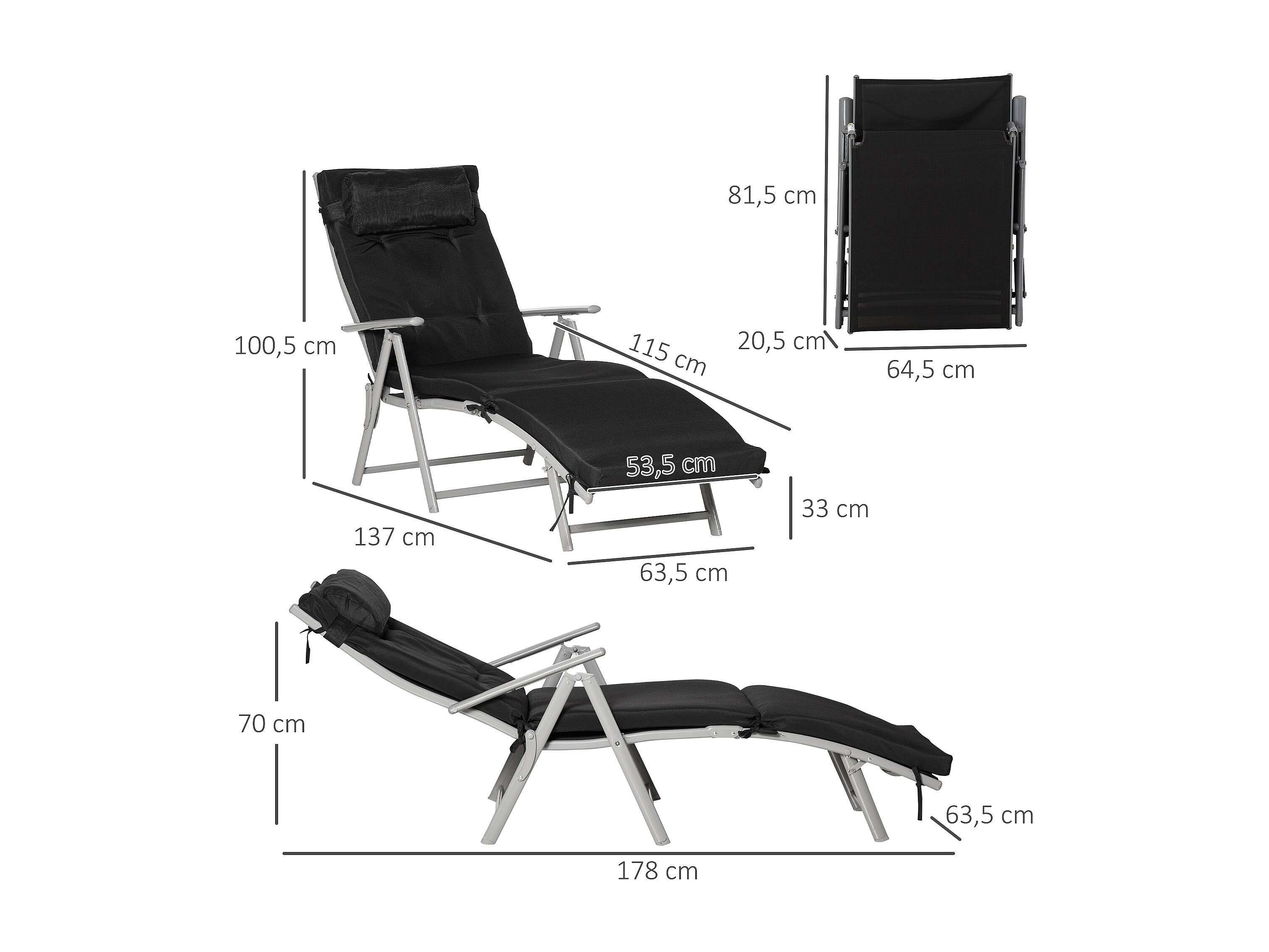 Chaise longue flessibile nera in tessuto, 7 posizioni, cuscinata, esterna, 137x63,5x100,5 cm