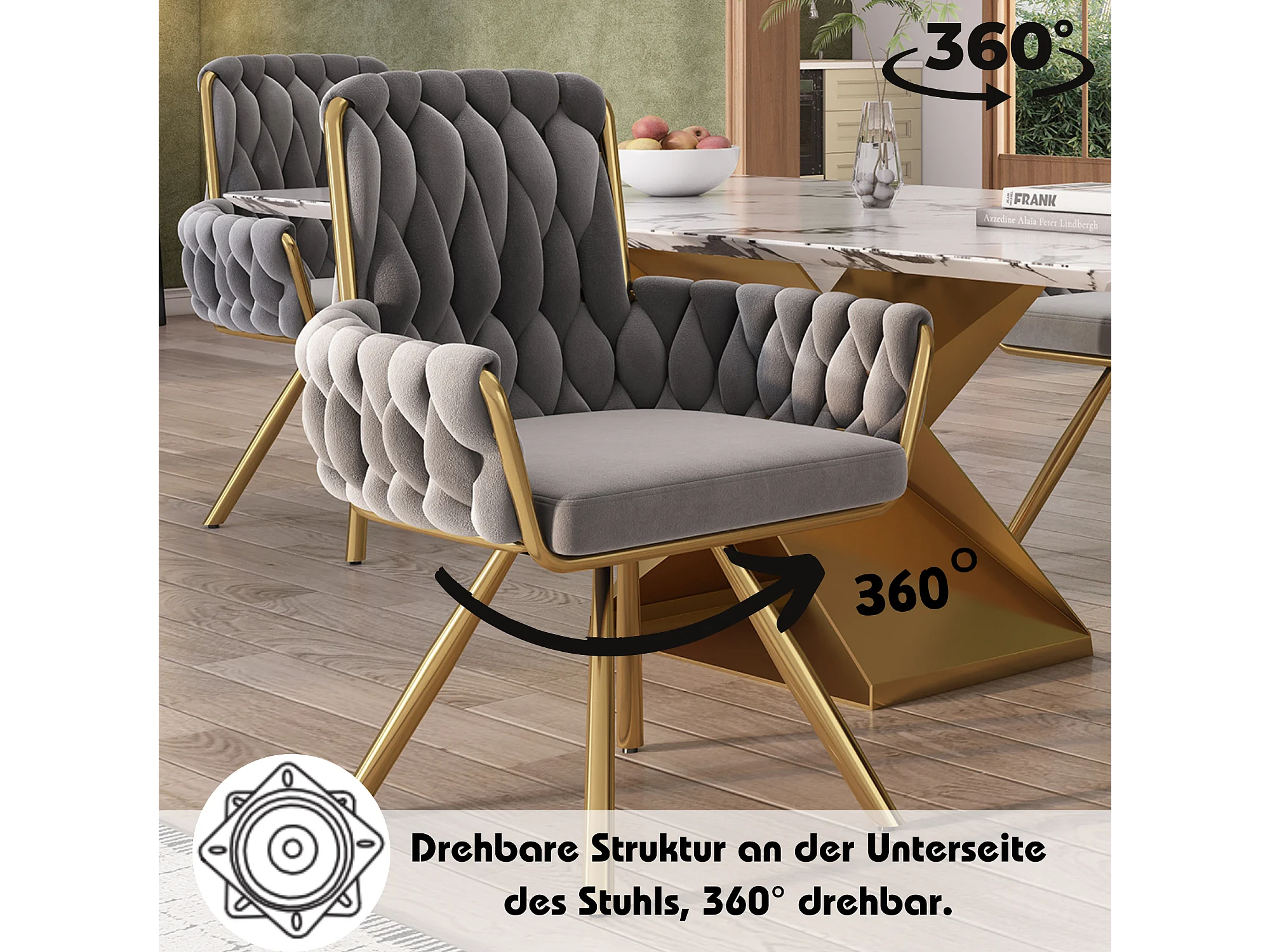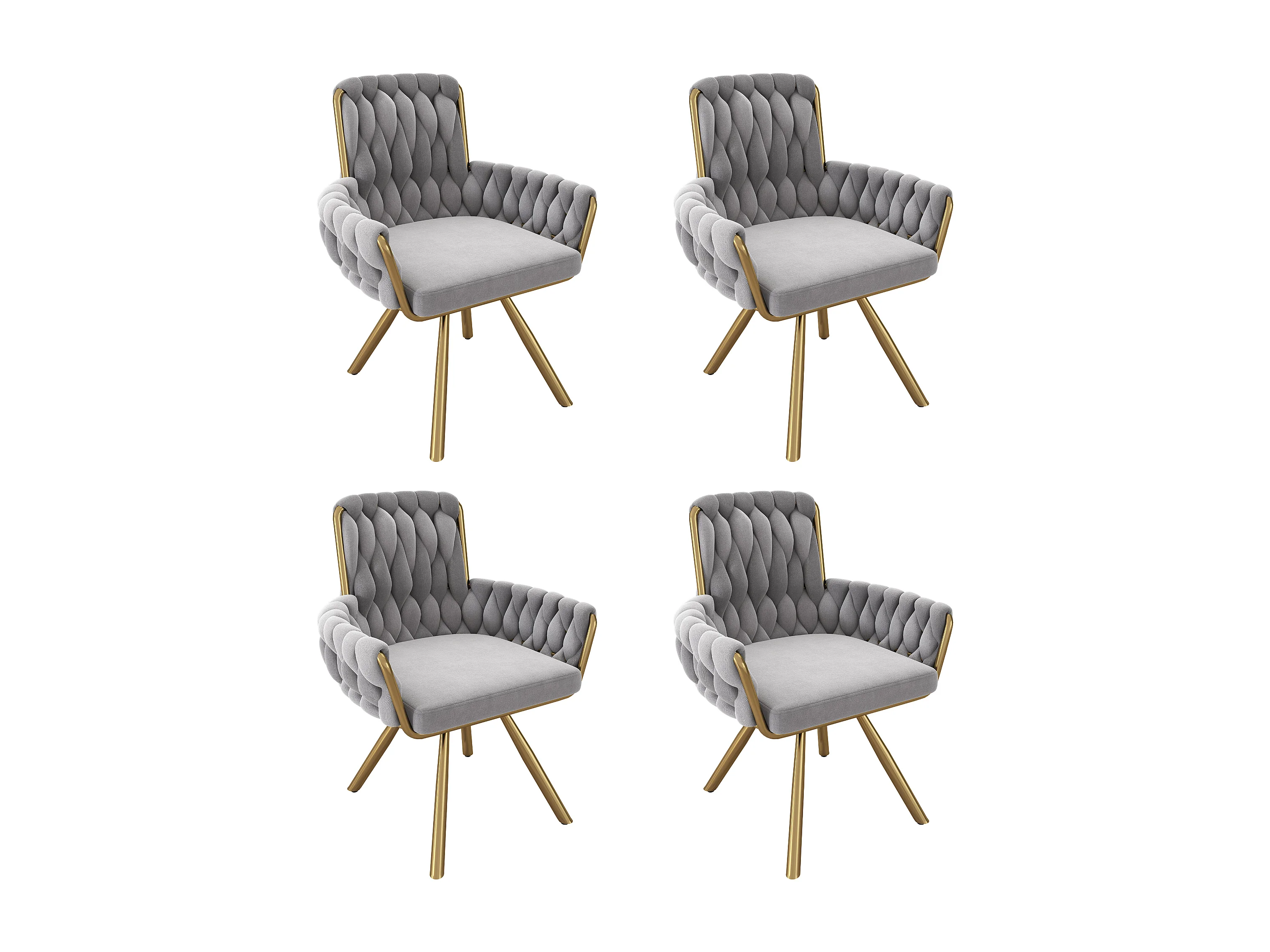 Chaise longue girevole in velluto grigio con sedili laterali e piedini in metallo per salone e camera, lotto da 4