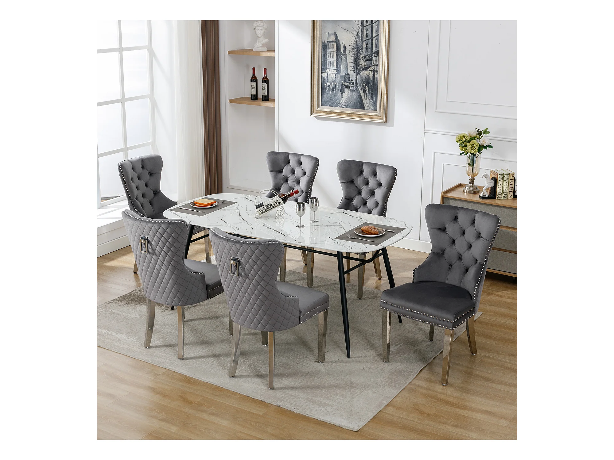 Chaise salle à manger velluto grigio pieds bois massiccio design confortevole capitonnè lotto di 6