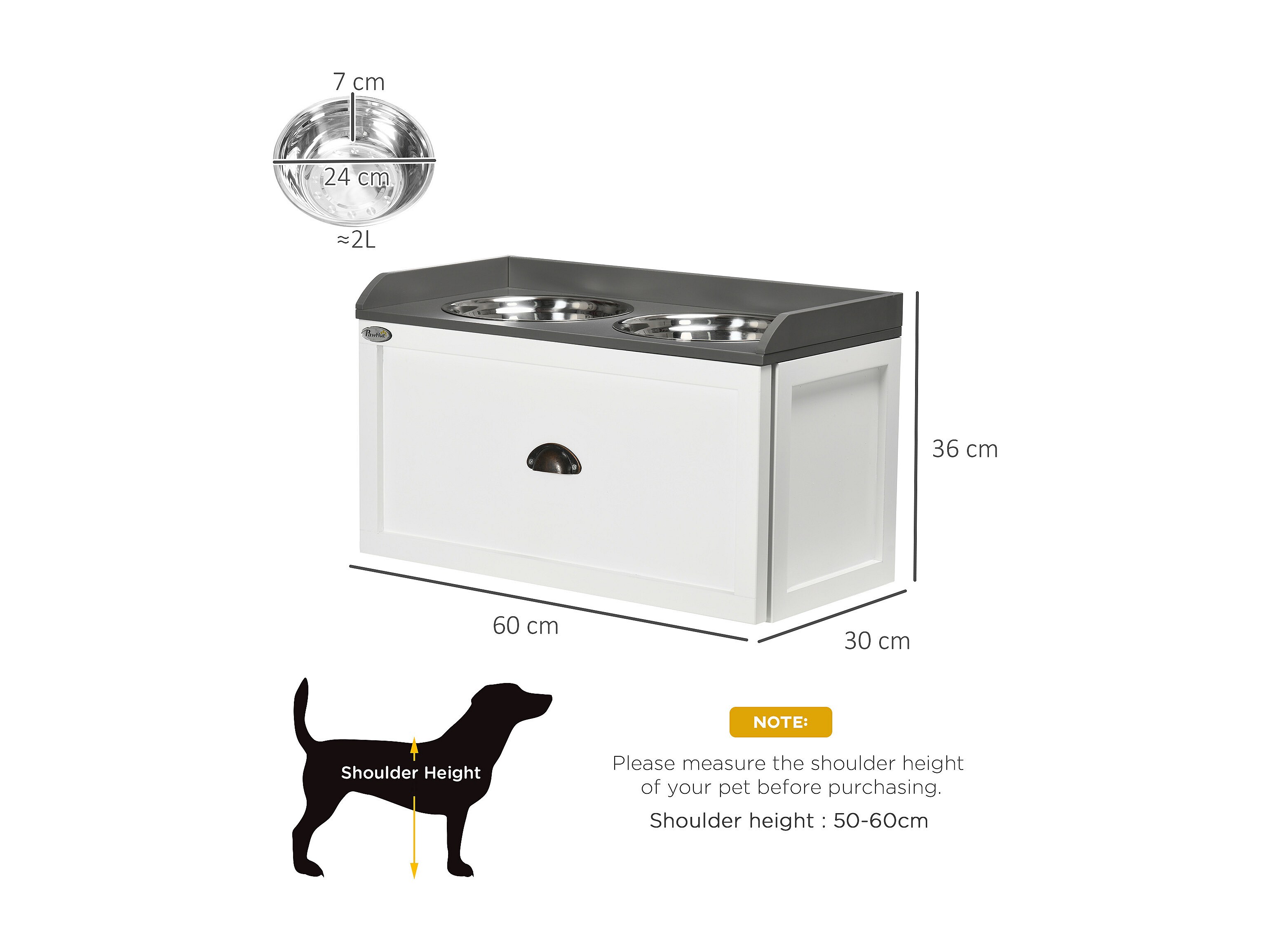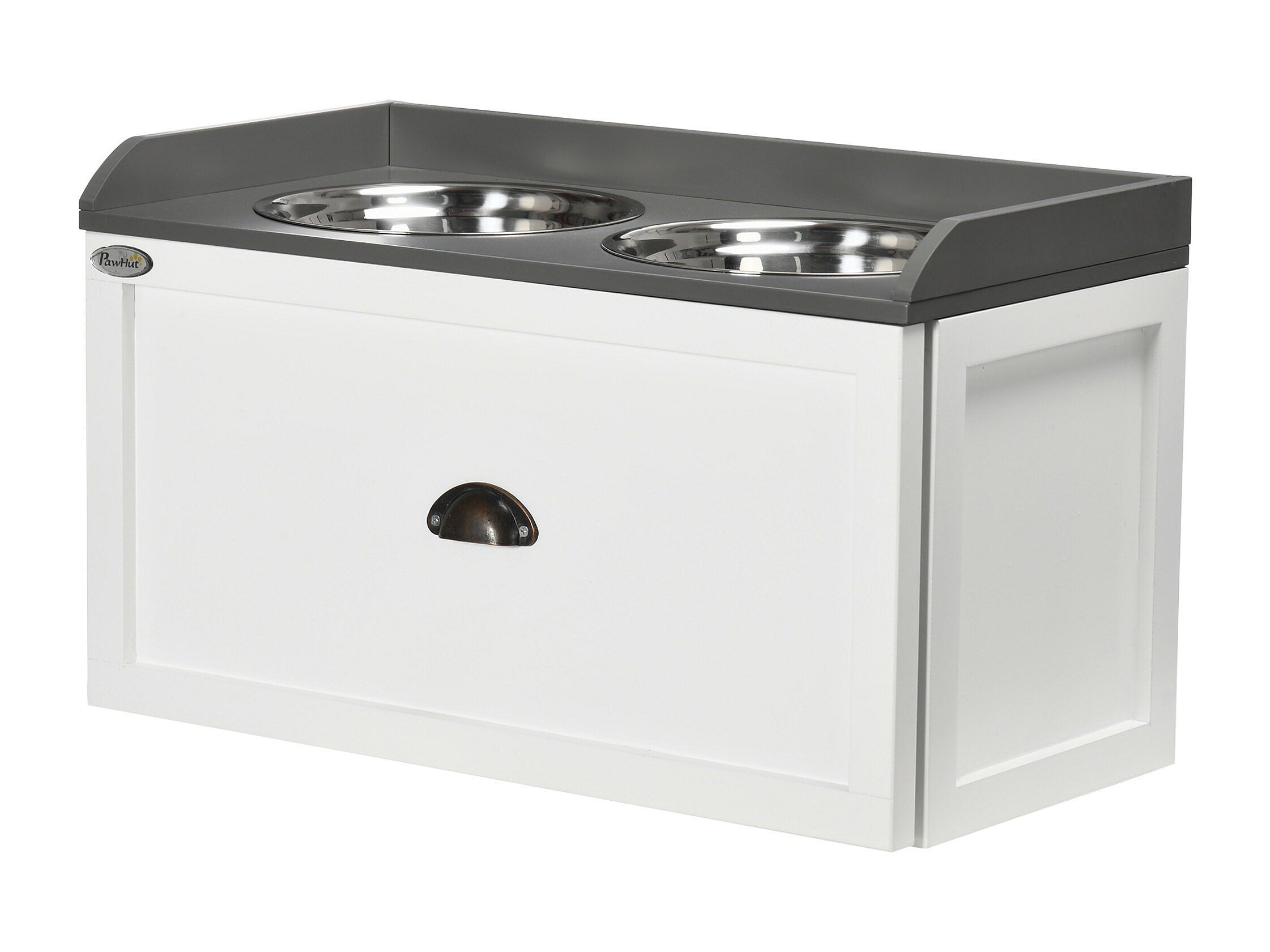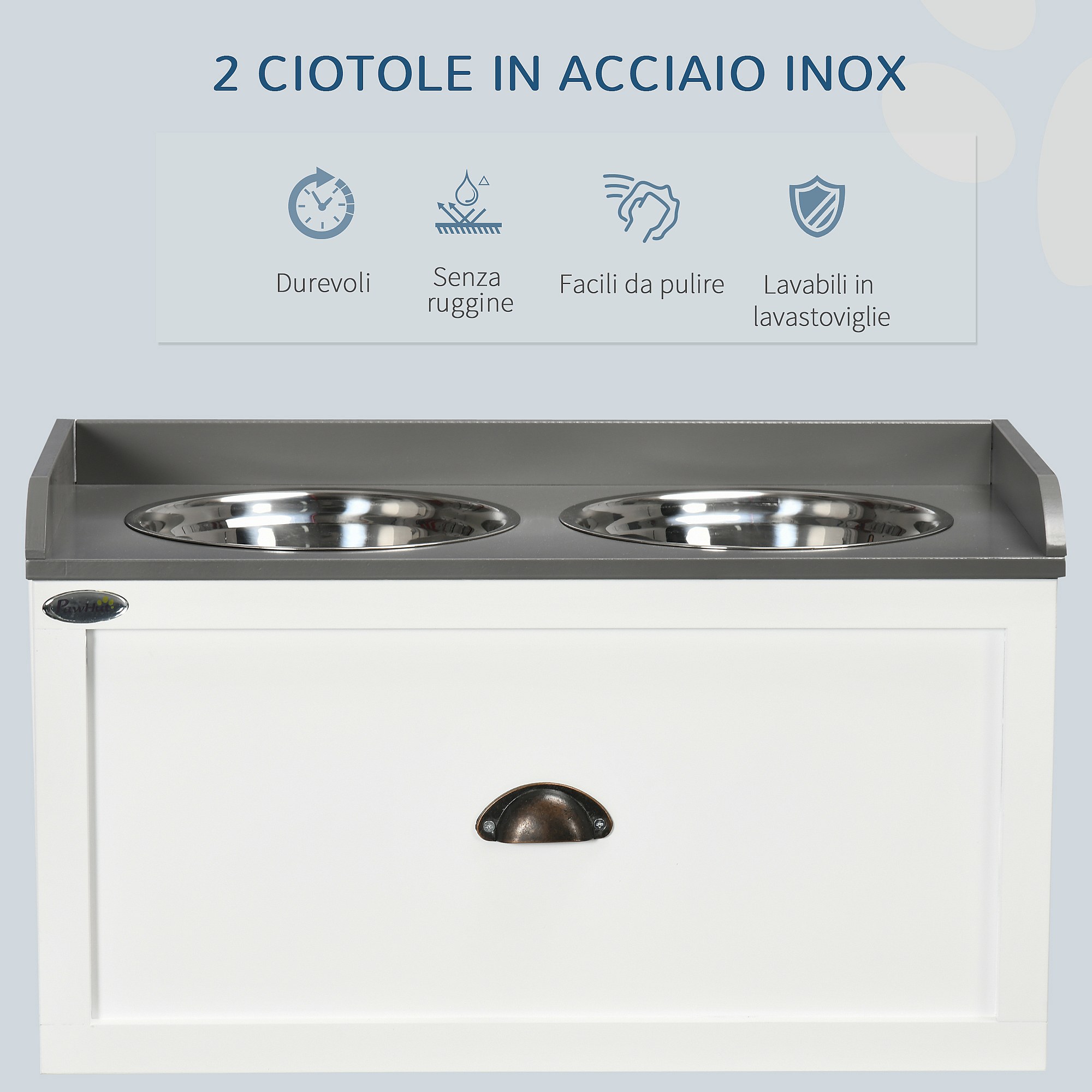 Ciotole per cani rialzate in acciaio inox e legno con cassetto 60x30x36cm