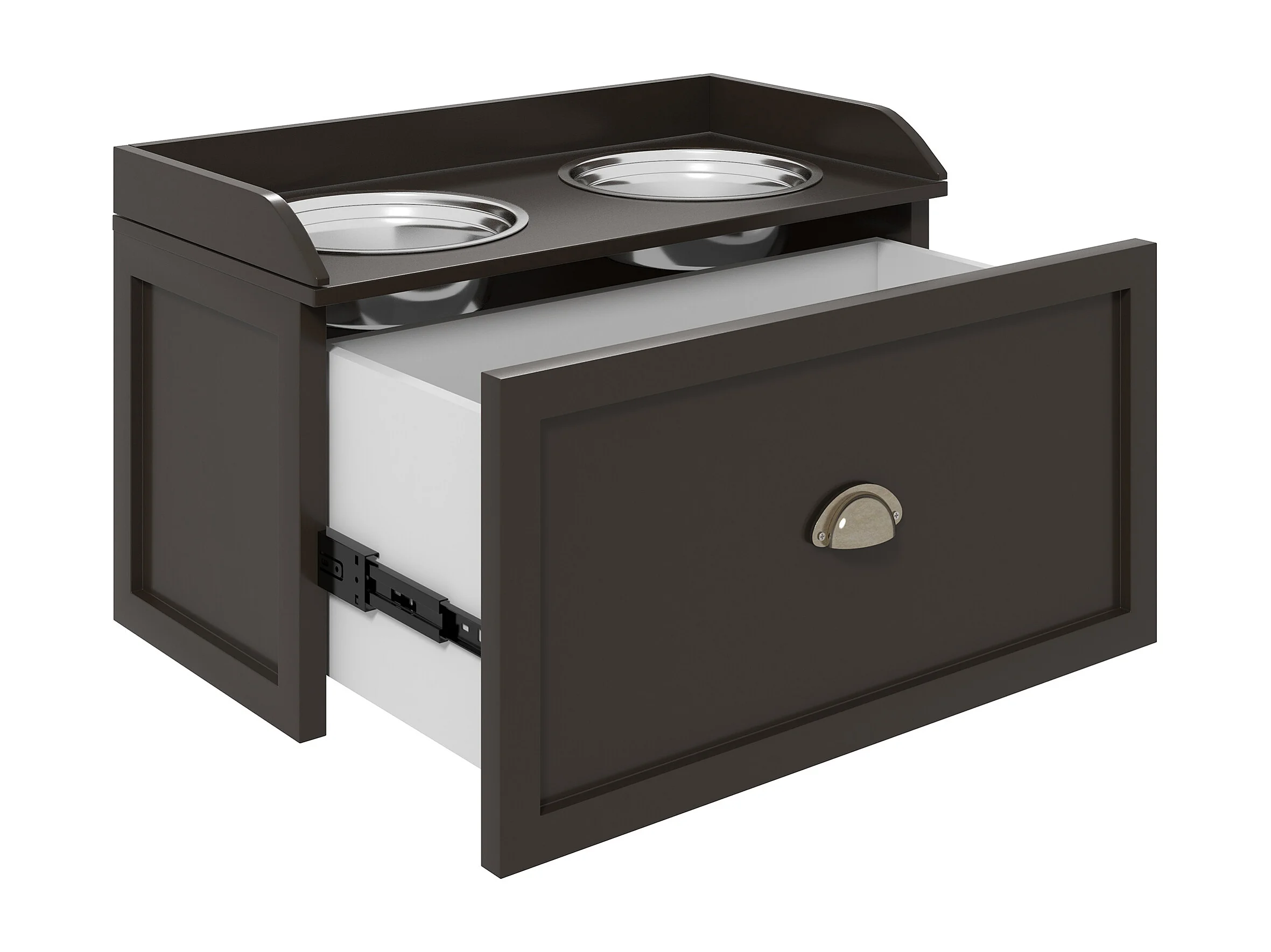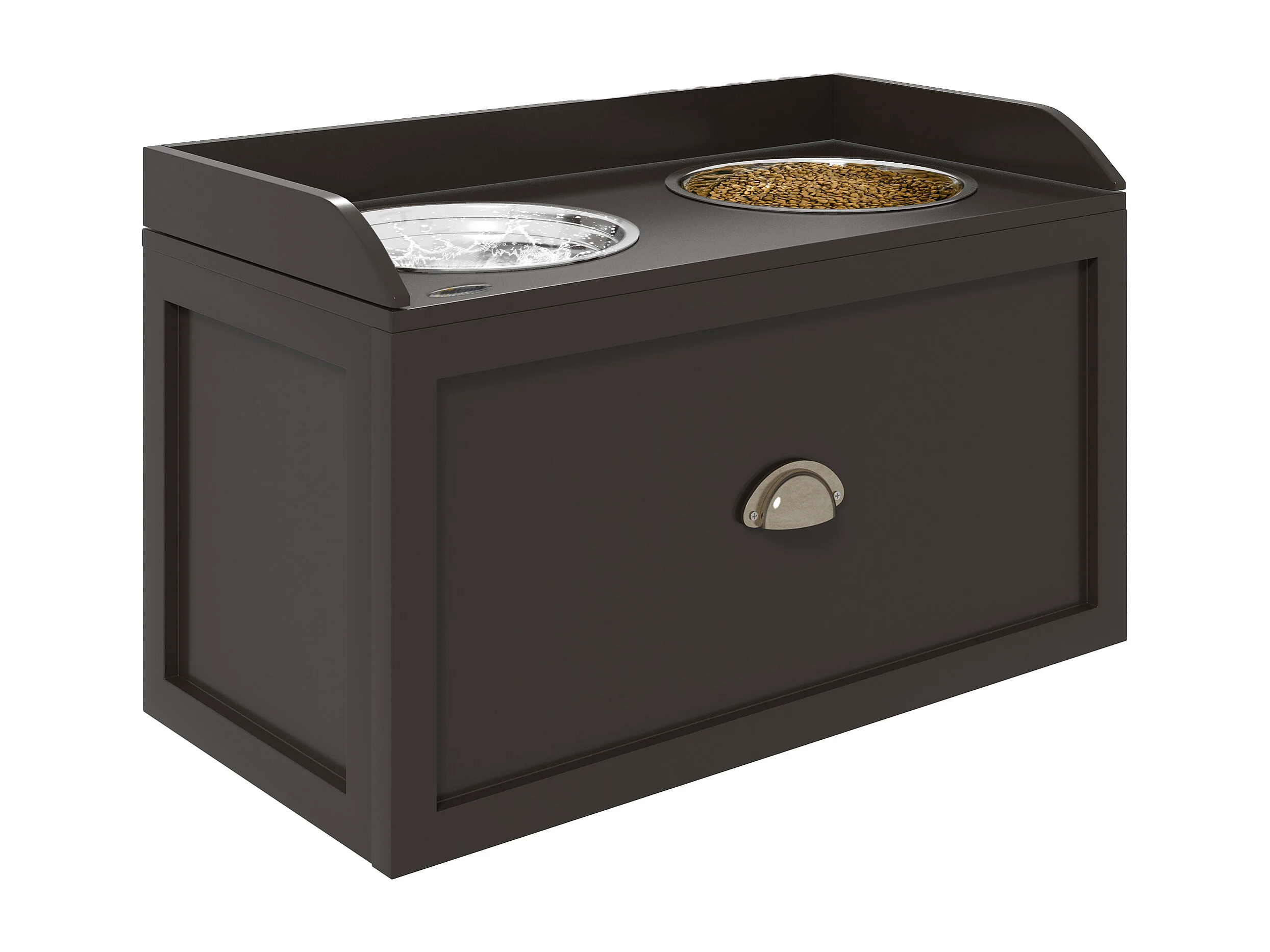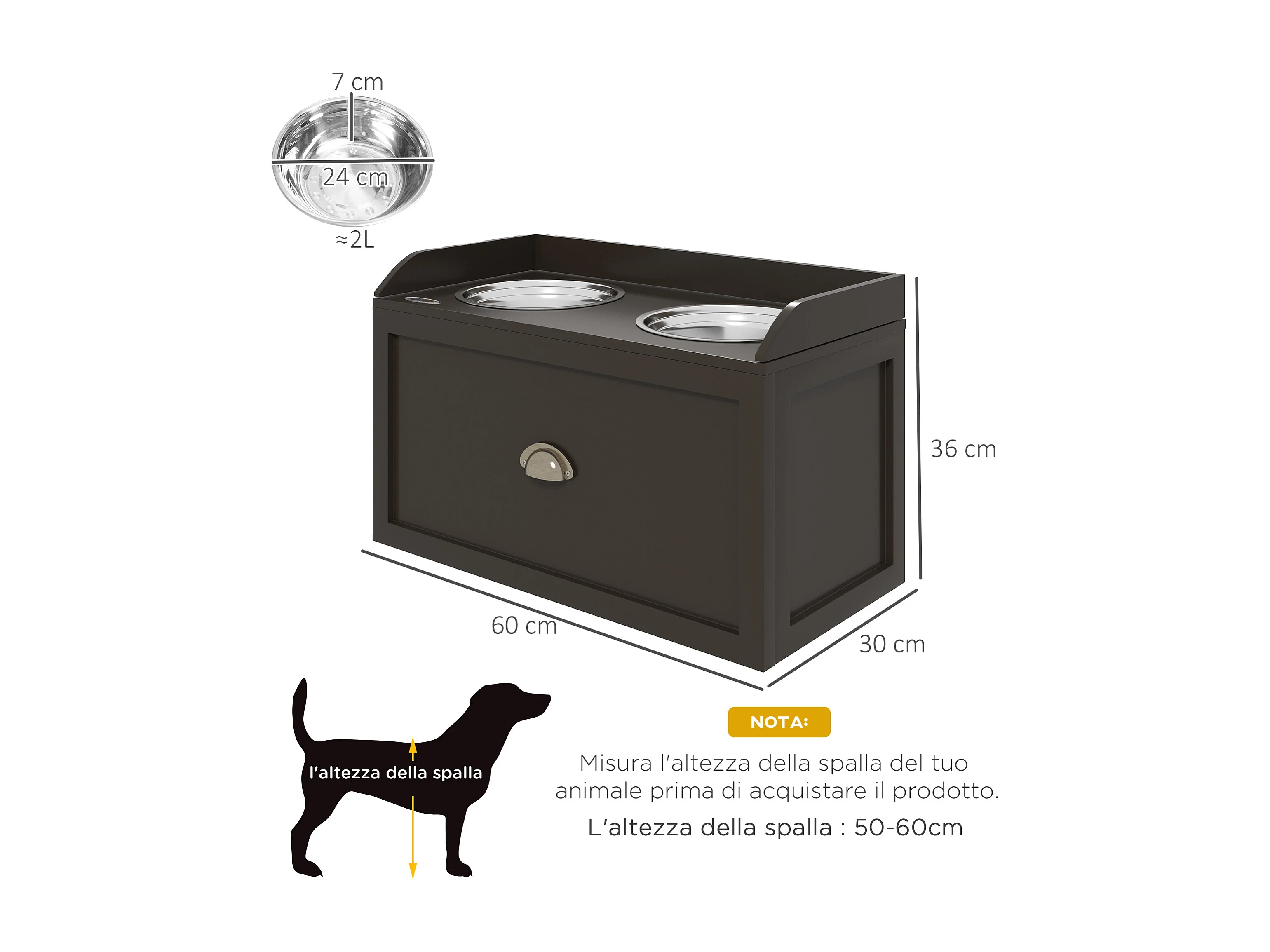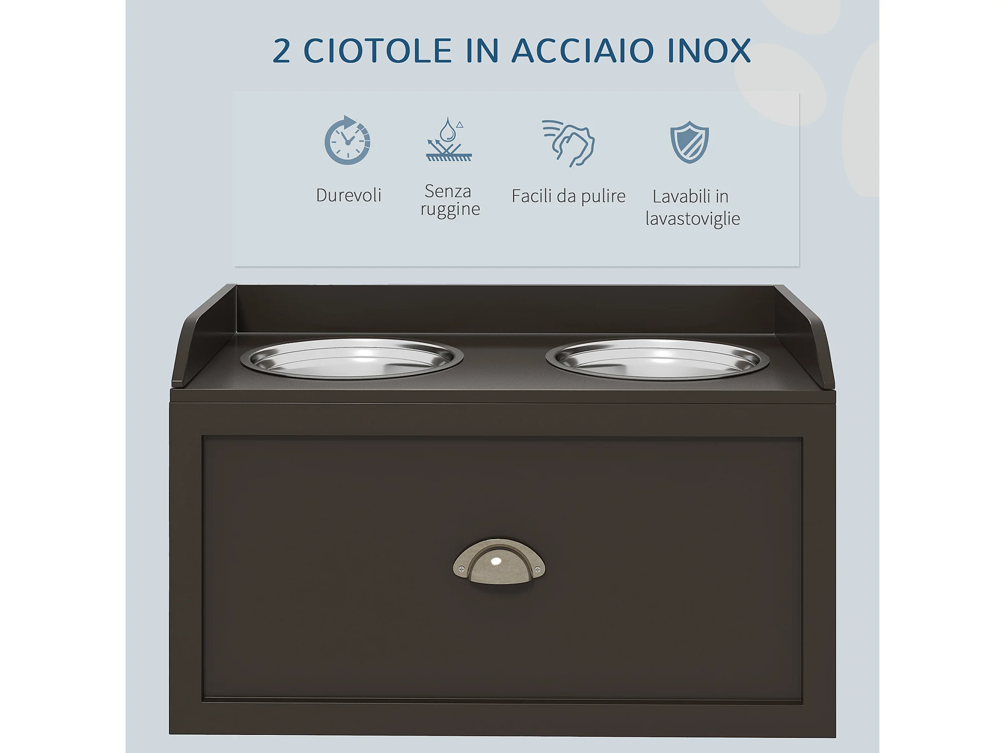 Ciotole per cani rialzate in acciaio inox e legno con cassetto marrone