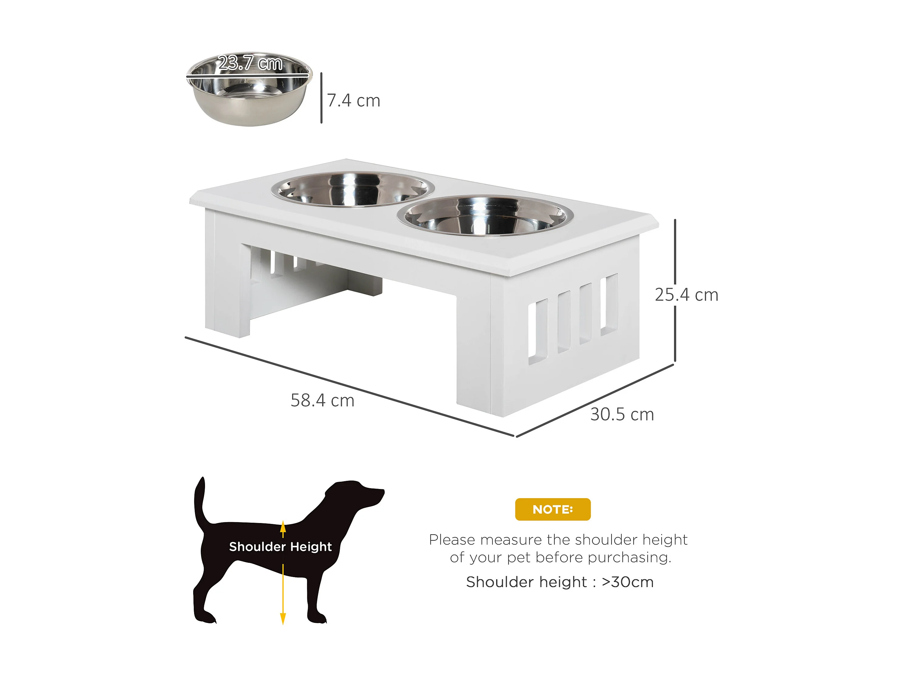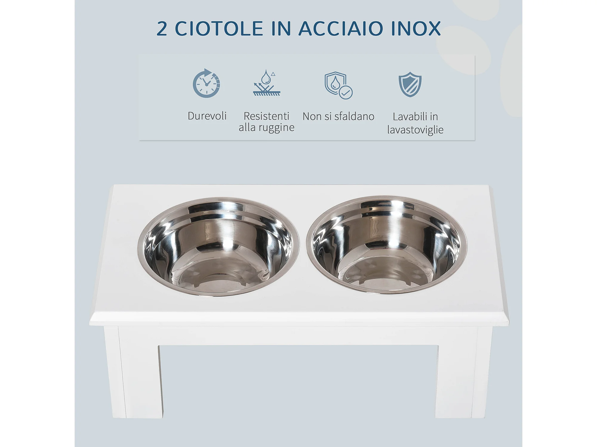 Ciotole rialzate per cani grandi in mdf e acciaio inox 60x30x41cm bianco