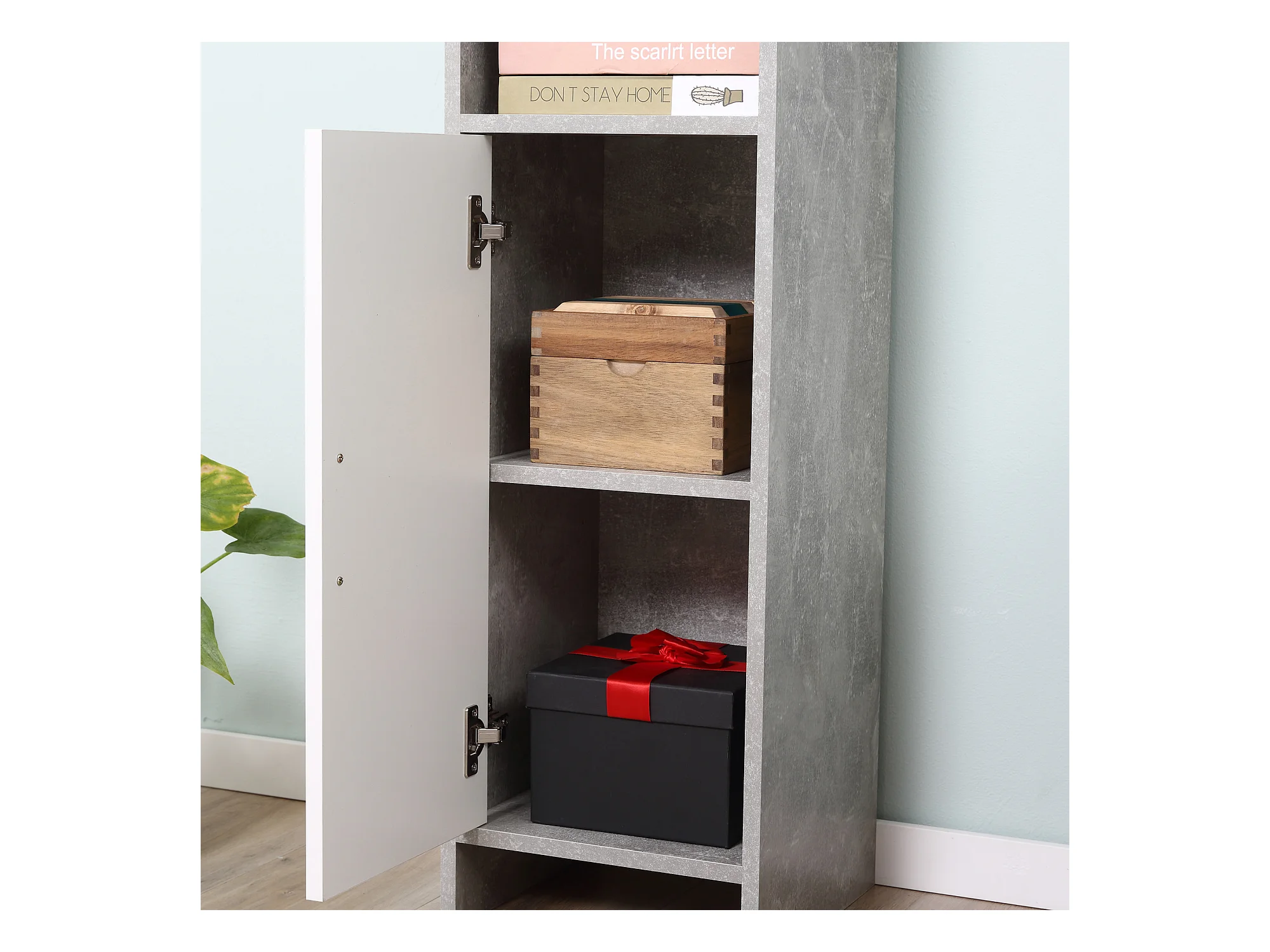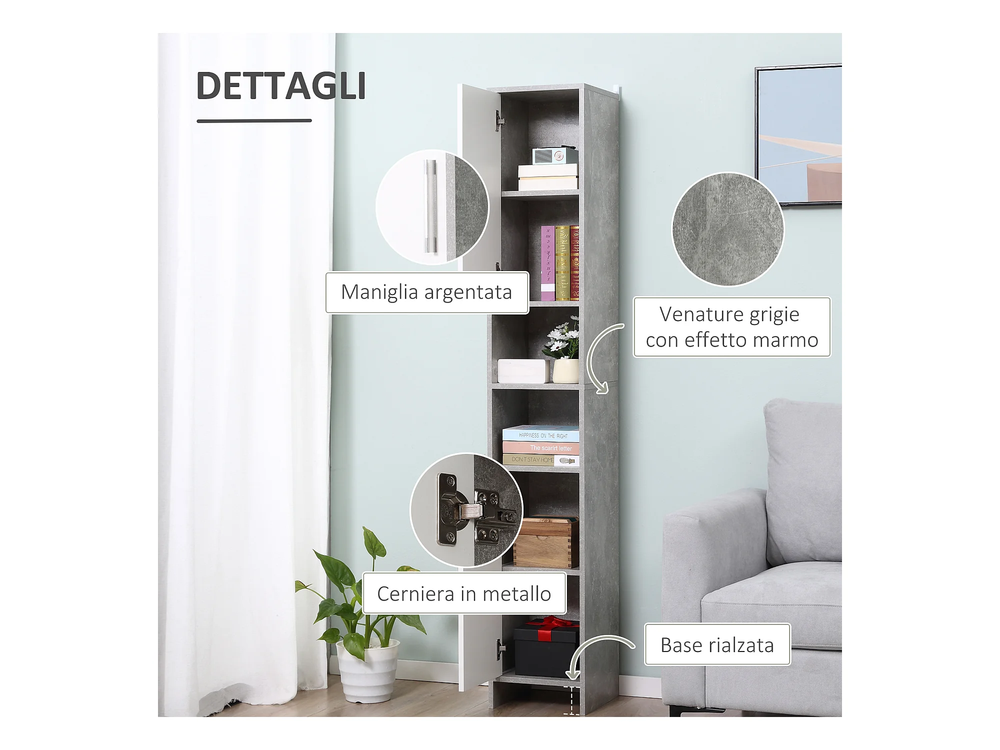 Mobile contenitore stretto con ripiani regolabili, 2 scomparti aperti, legno, grigio (30x30x183 cm)