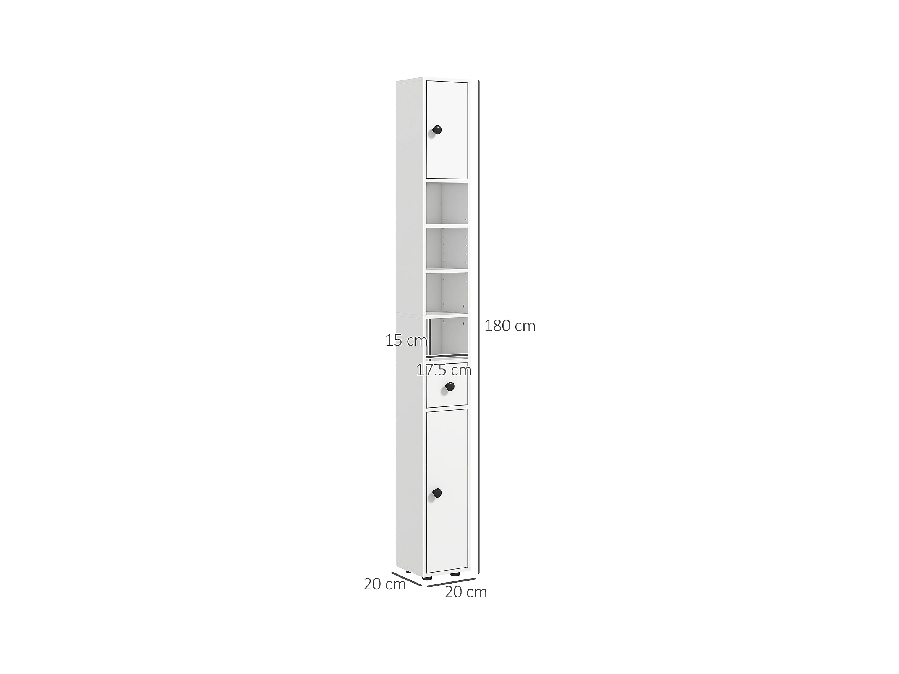 Colonna da bagno stretta, cassetto e 4 nicchie a giorno, in melaminico, bianco, salvaspazio (20x20x180cm)