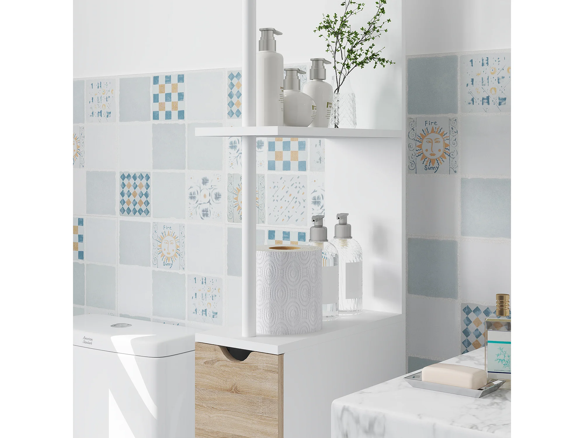 Colonna bagno con 2 armadietti e ripiani aperti bianco e legno