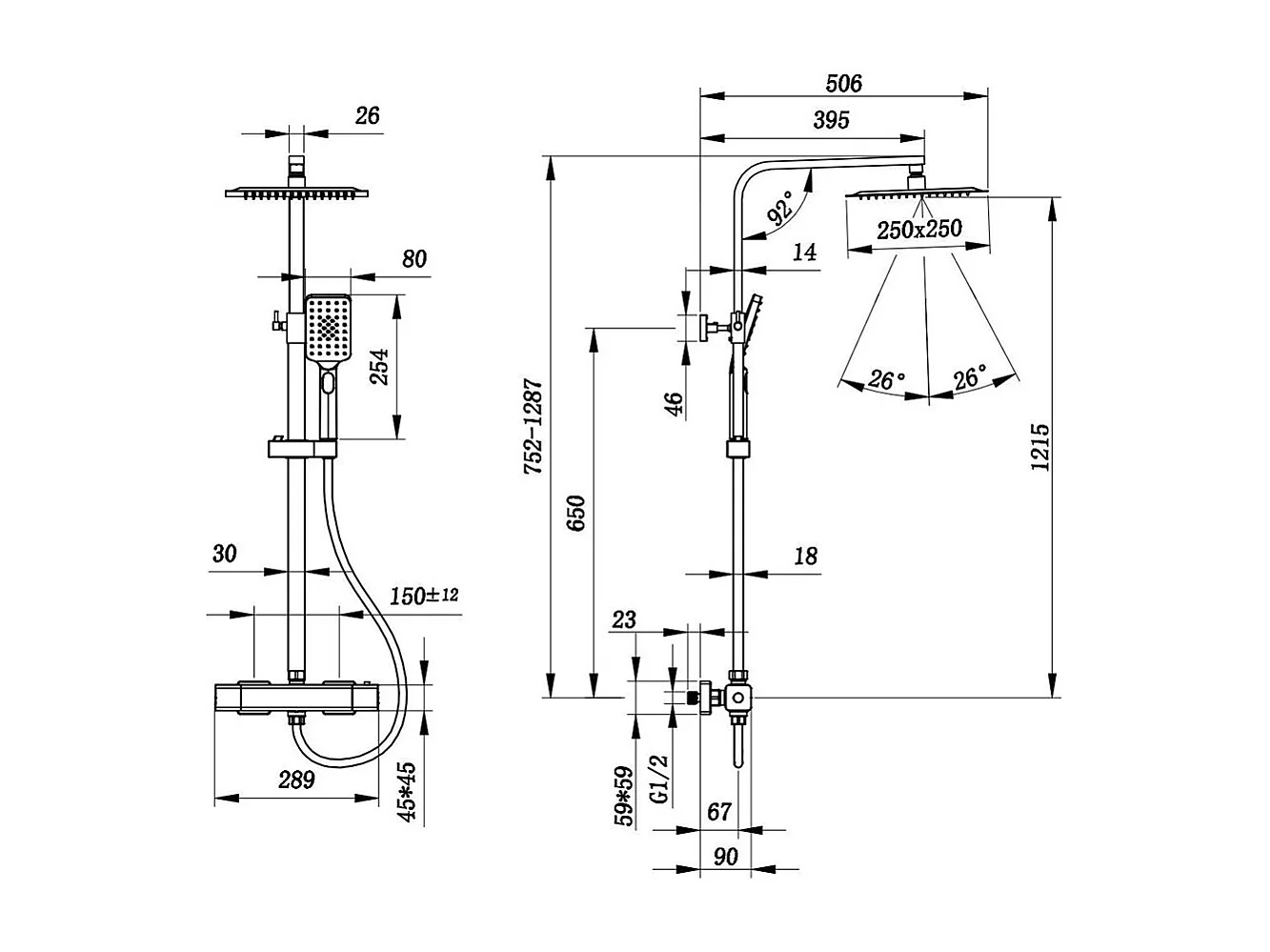 Colonna doccia con miscelatore termostatico, siffione doccia quadrato 25x25cm acciaio inox, cromato