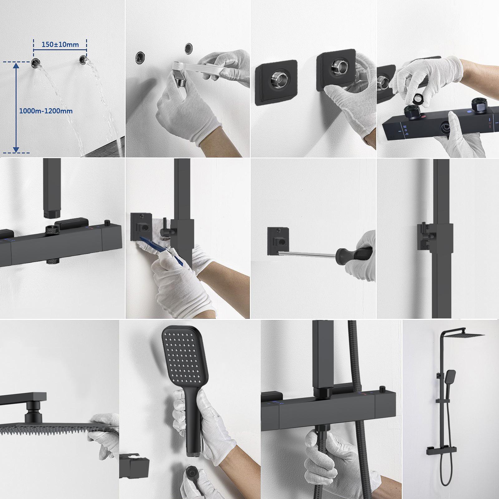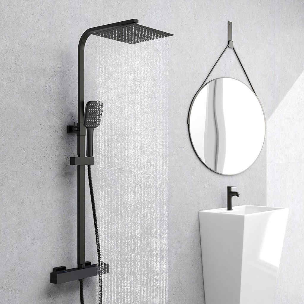 Colonne Doccia Termostatiche, Sistema Doccia con Miscelatore Termostatico a 38℃ e Soffione Quadrato Altezza Regolabile 73-115cm Nero