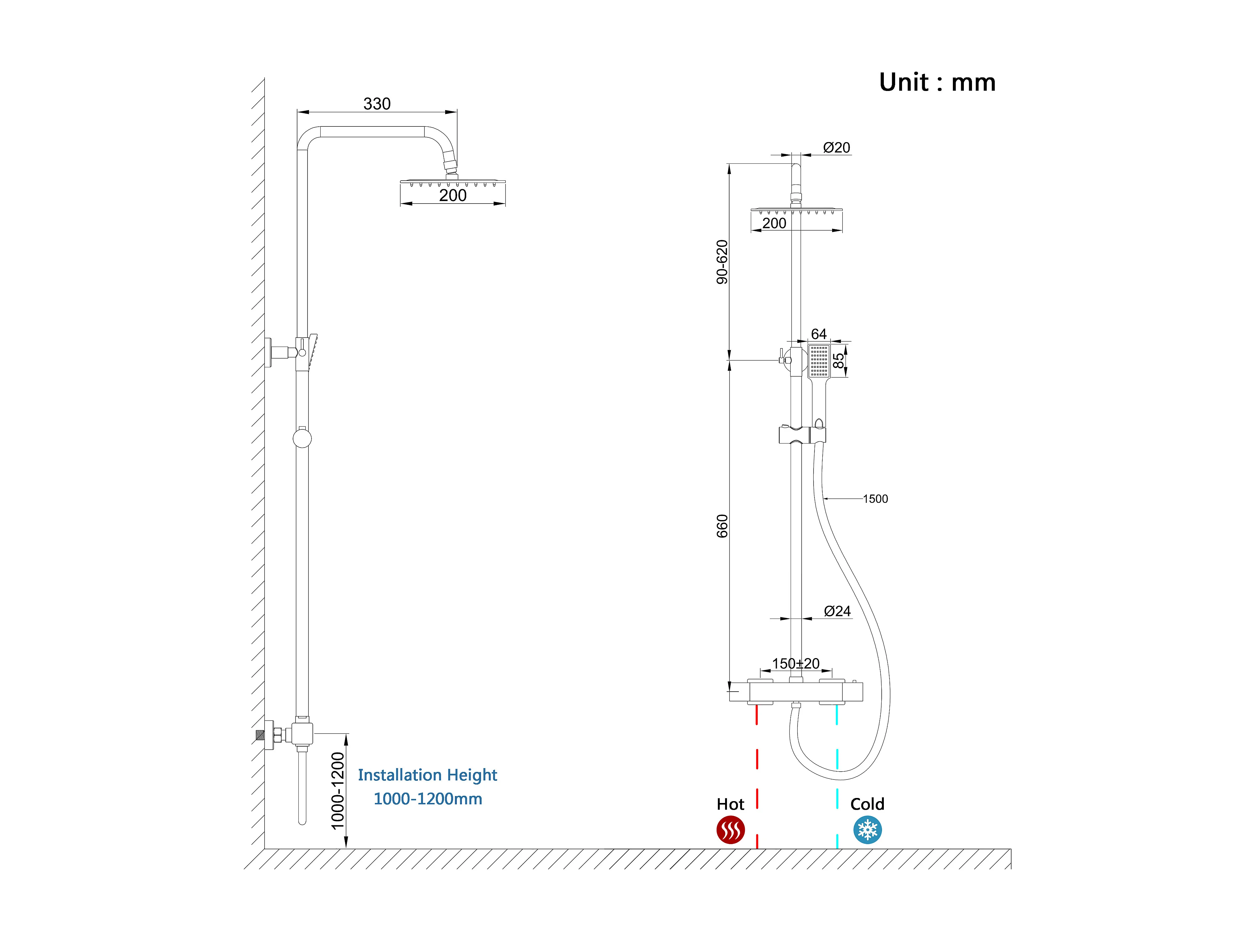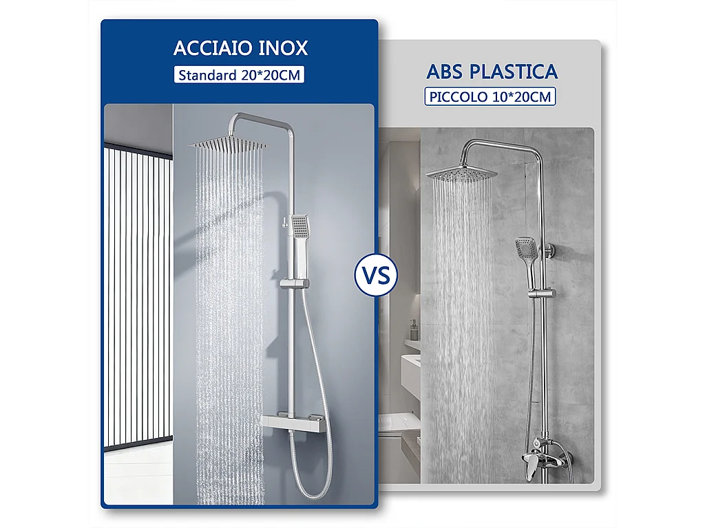 colonna doccia rotonda completo di miscelatore termostatico rettangolo, soffione quadrato 20x20cm, cromo