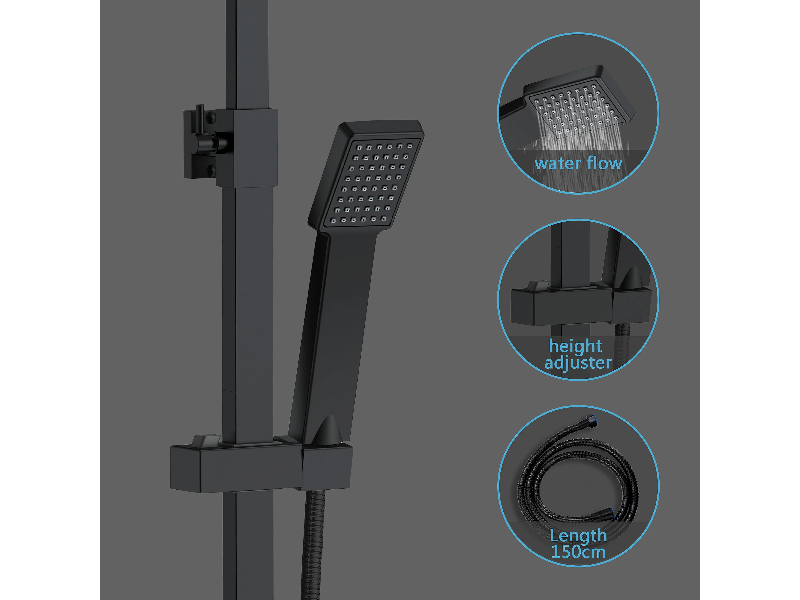 Colonne doccia nero, soffione doccia quadrato 20x20cm acciaio inox, saliscendi doccia tondo regolabile 75-125cm