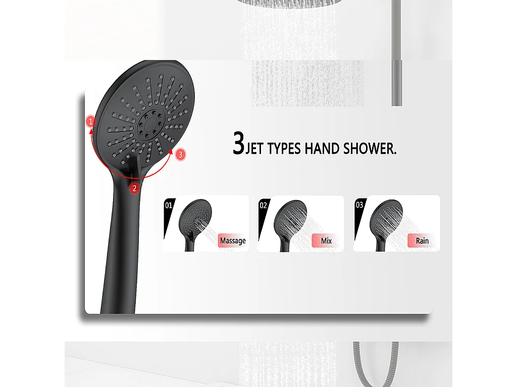 Colonna doccia idromassaggio con miscelatore termostatico, doccetta rotonda a 3 getti, nero opaco