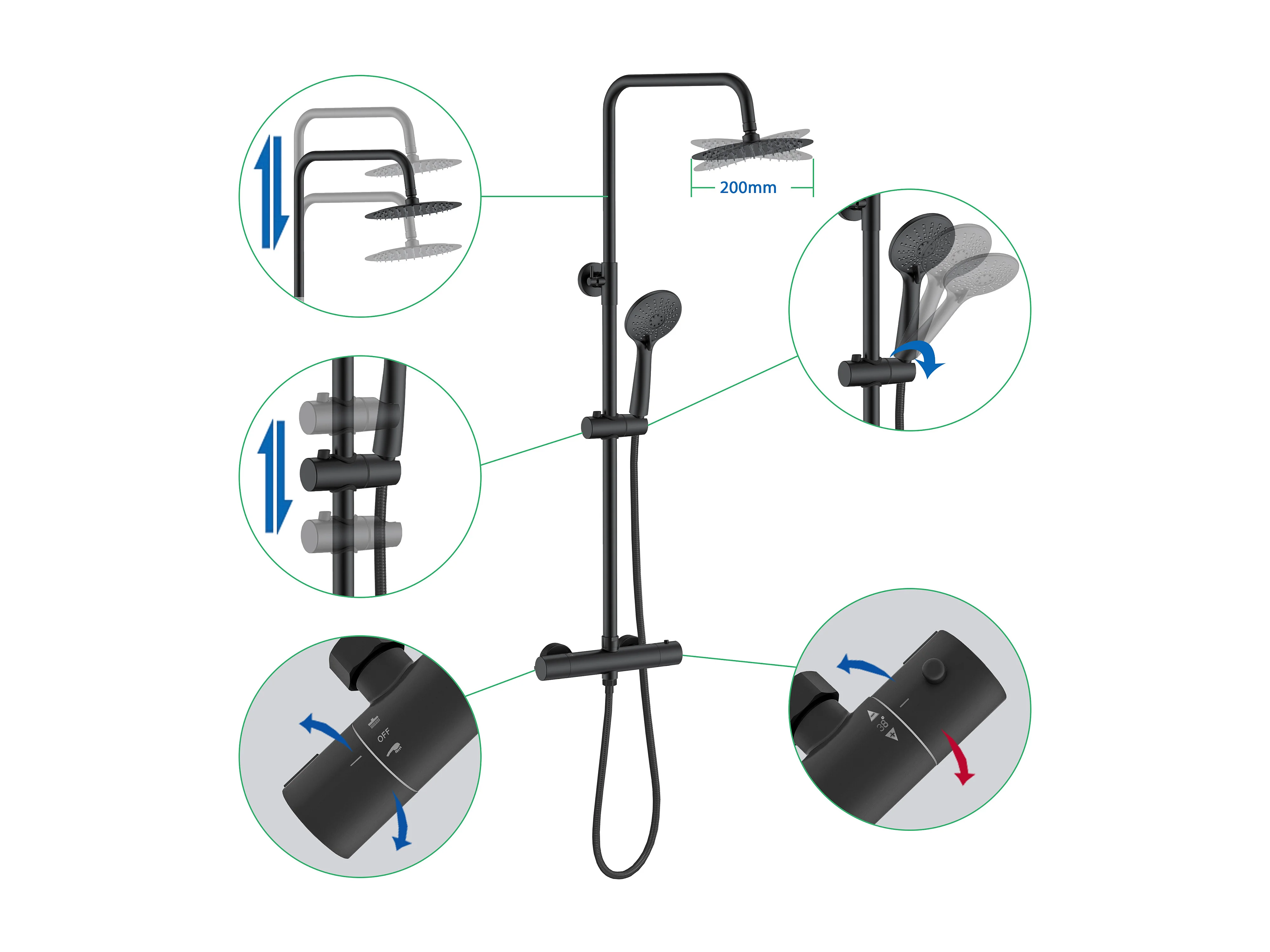 Miscelatore doccia termostatico con manopola in lega di zinco,colonna doccia soffione acciaio inox, nero