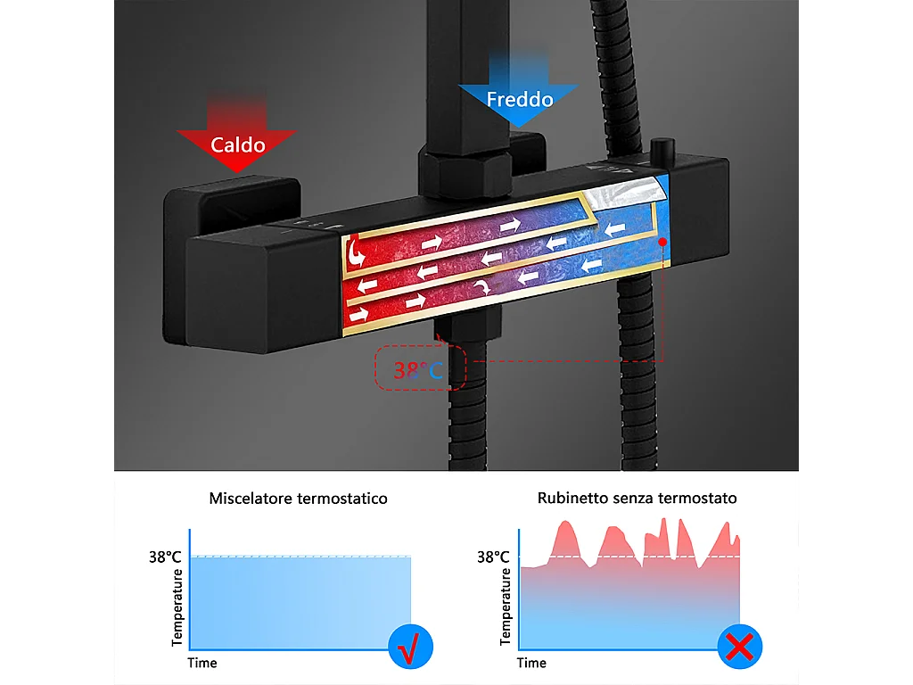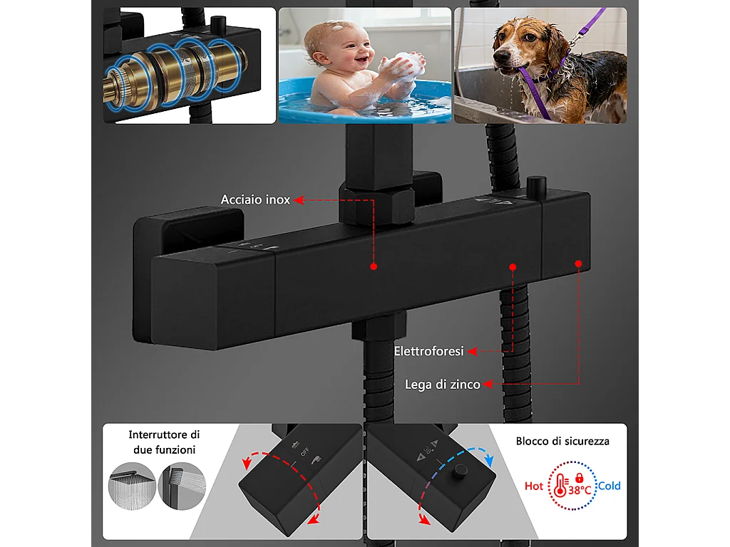 Colonna doccia termostatica, Aica ITALY soffione doccia 20*20CM, regolabile in altezza 75-115cm, set doccia con miscelatore, nero