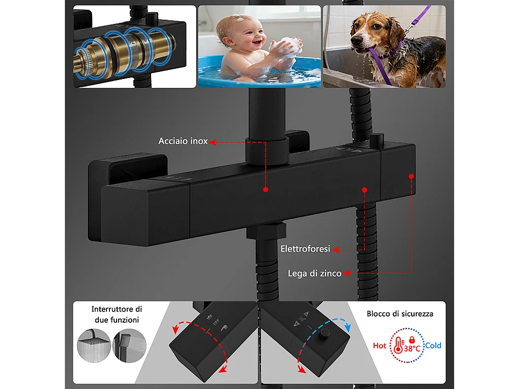Colonna doccia termostatica, Aica ITALY soffione doccia 20*20CM, regolabile in altezza 75-115cm, set doccia con miscelatore, nero