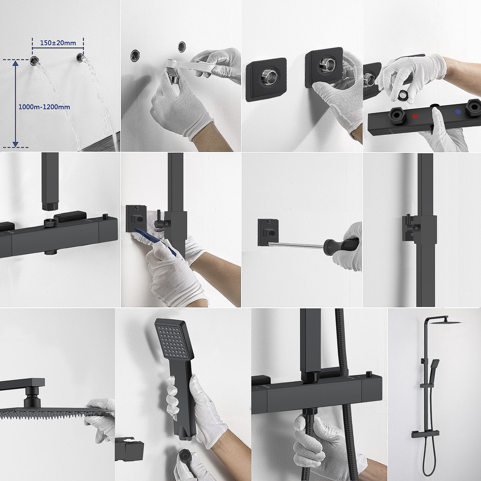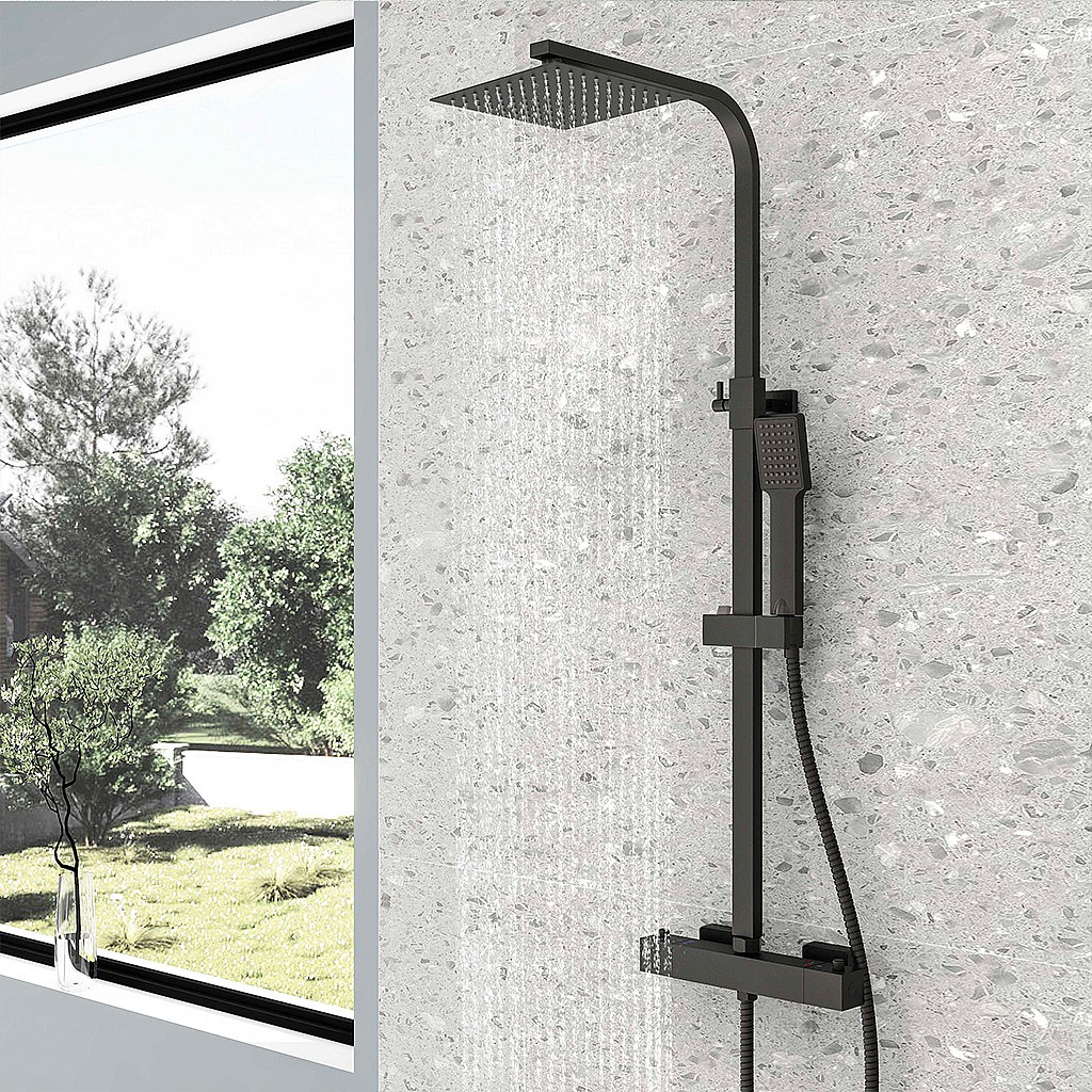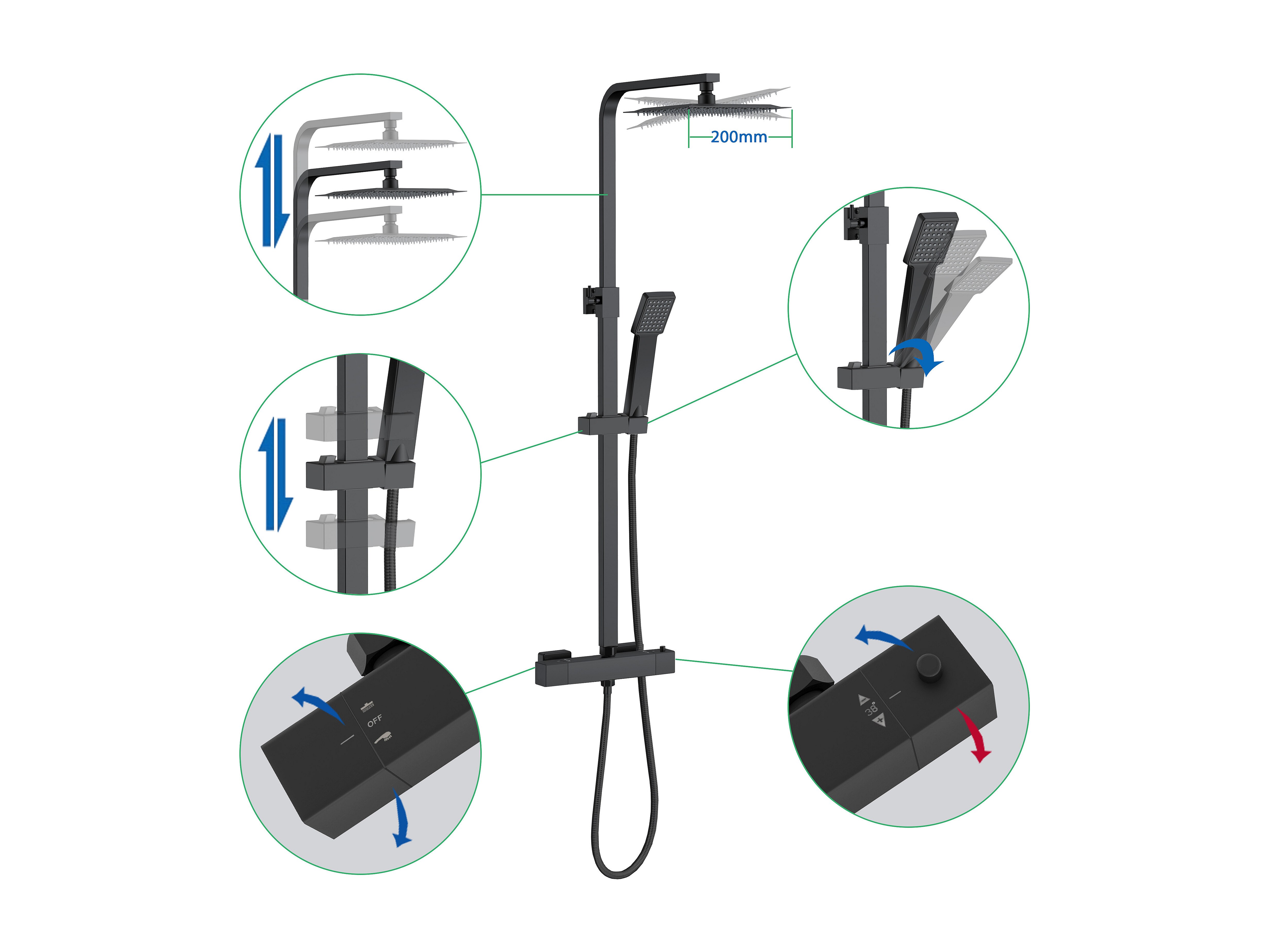 Colonne doccia termostatiche con soffione quadrato 20x20cm in acciaio inox e altezza regolabile 73-115cm, nero