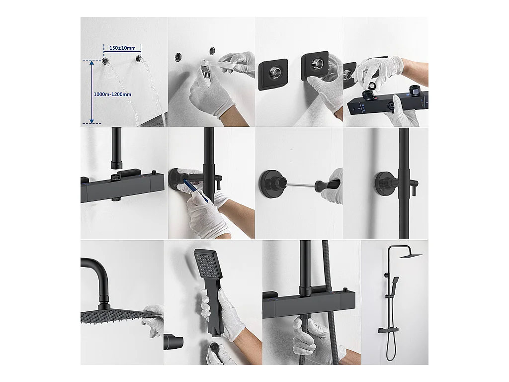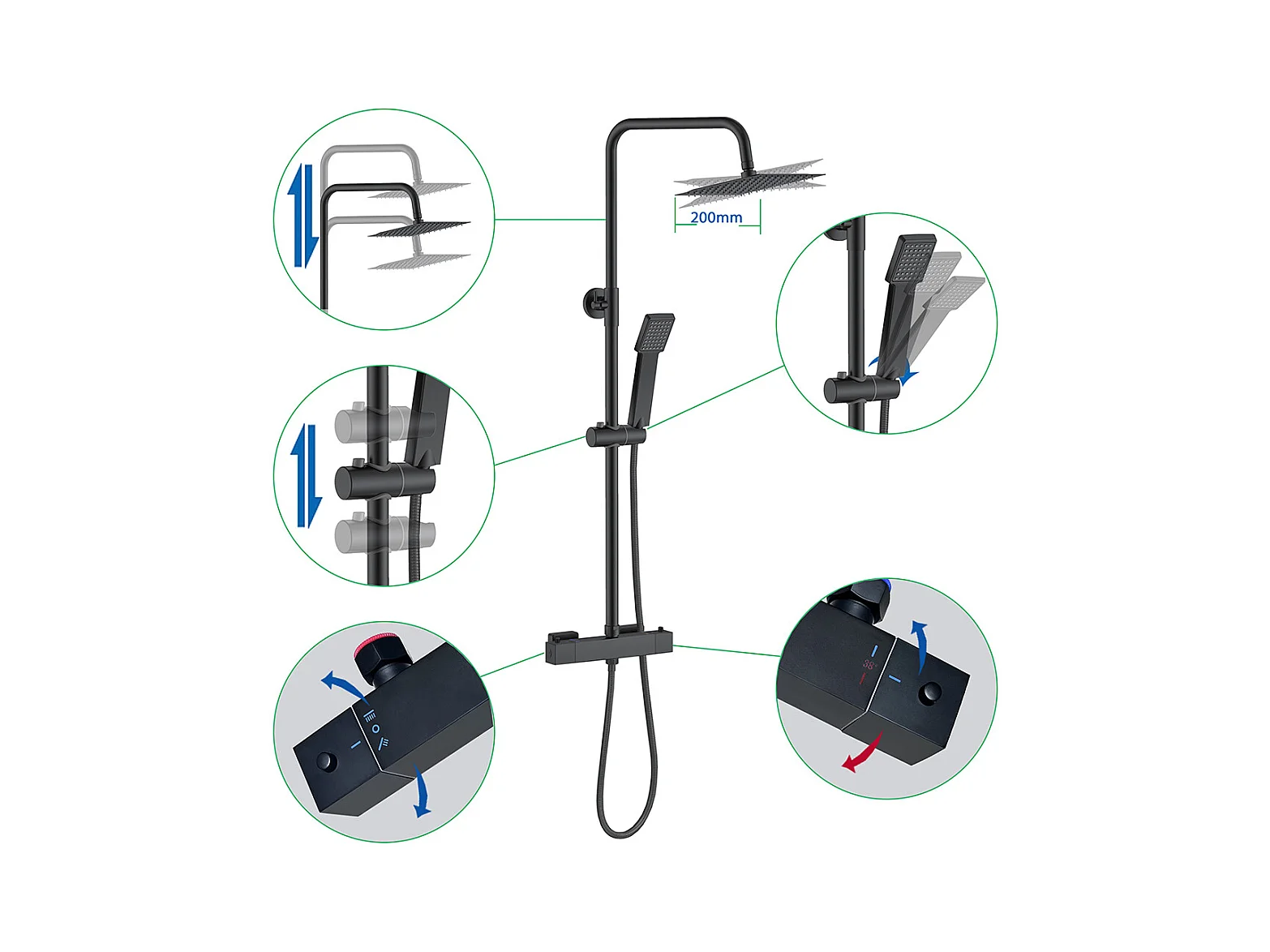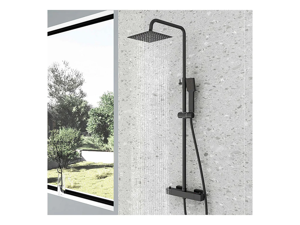 Colonne doccia termostatiche con soffione quadrato 20x20cm in acciaio inox e altezza regolabile 73-115cm, nero