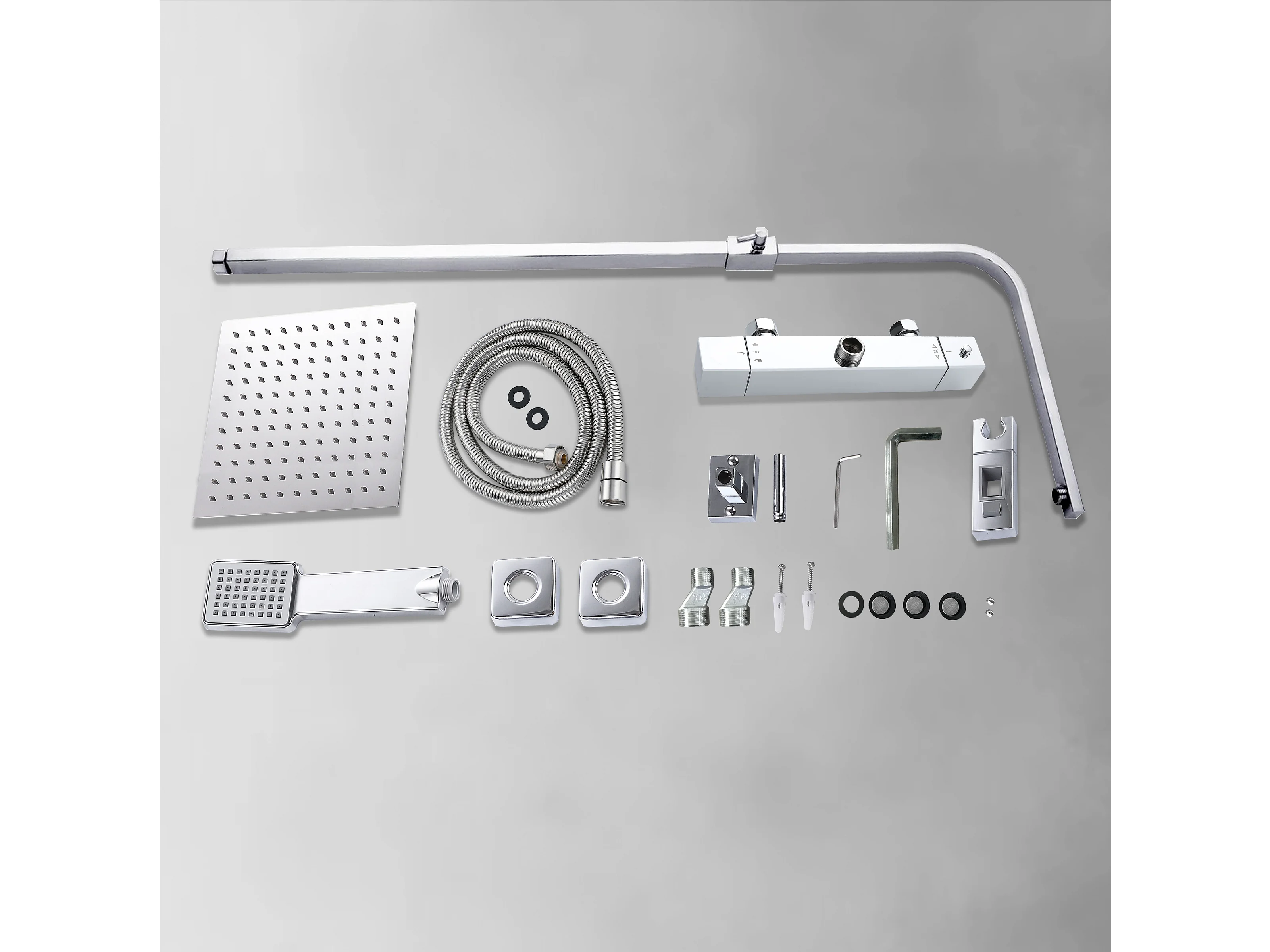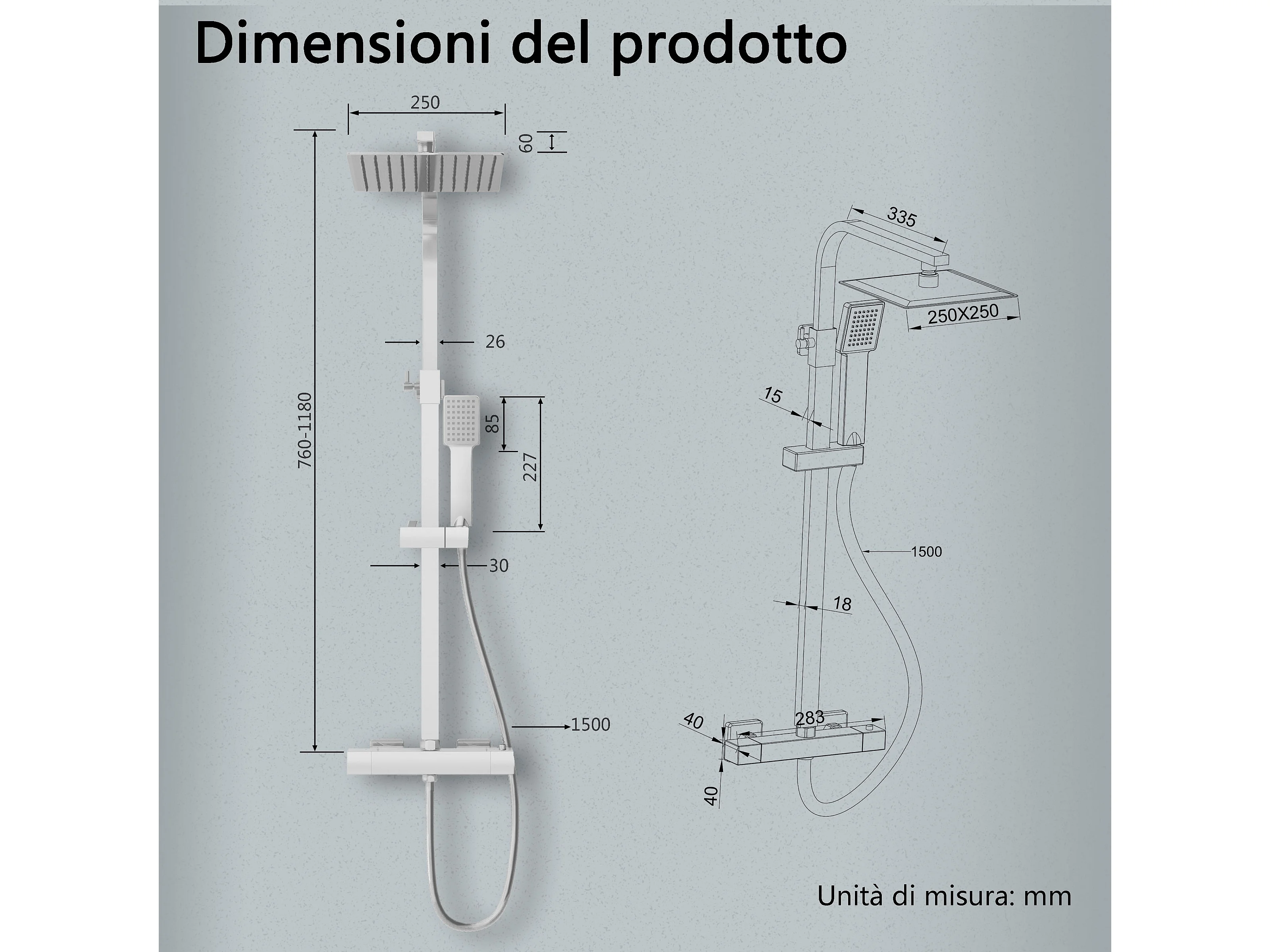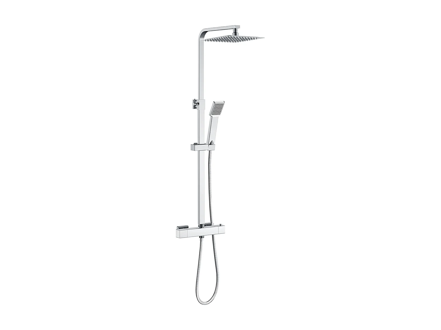 Colonne doccia termostatiche con soffione quadrato 25x25cm in acciaio inox e altezza regolabile 76-118cm, cromato