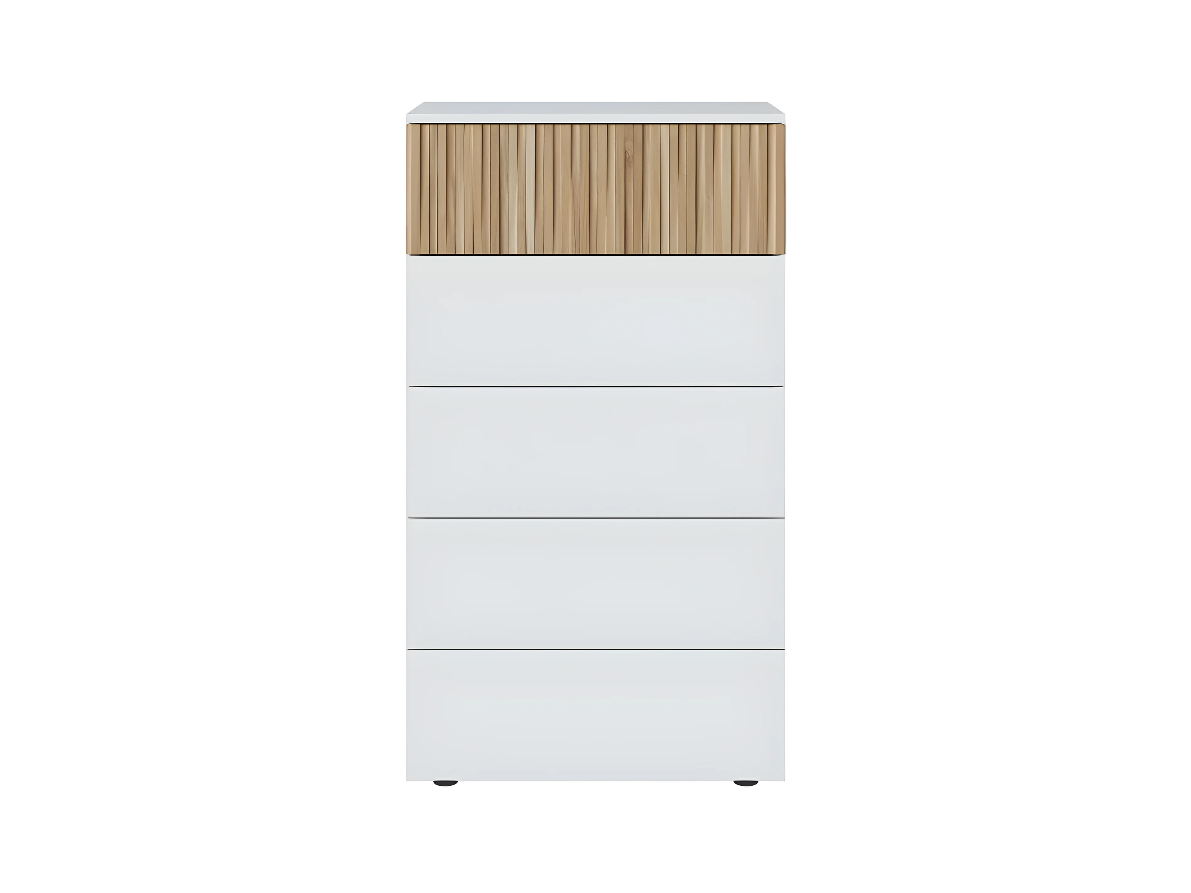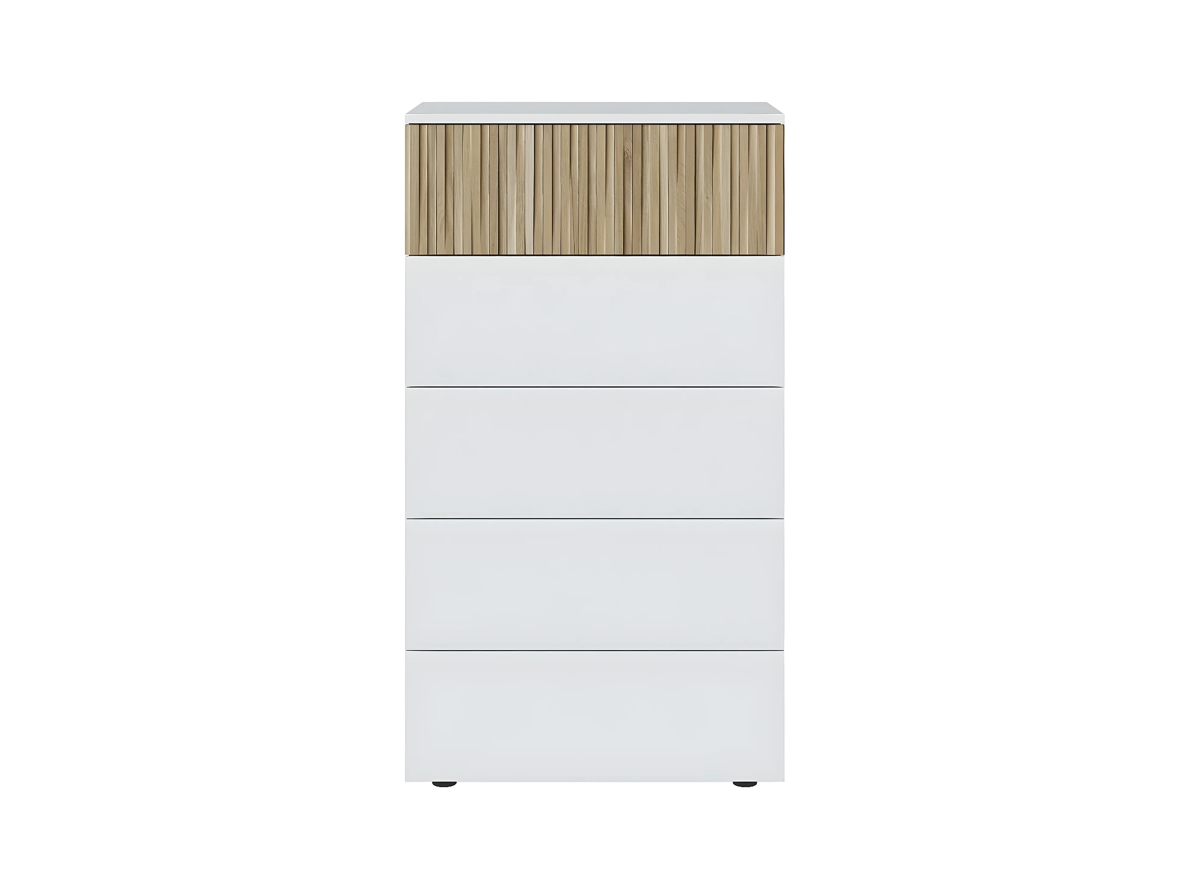 Cassettiera Wynne, Settimanale a 5 cassetti, Mobile Comò per camera da letto, Comò moderno, 61x40h109 cm, Bianco e Rovere
