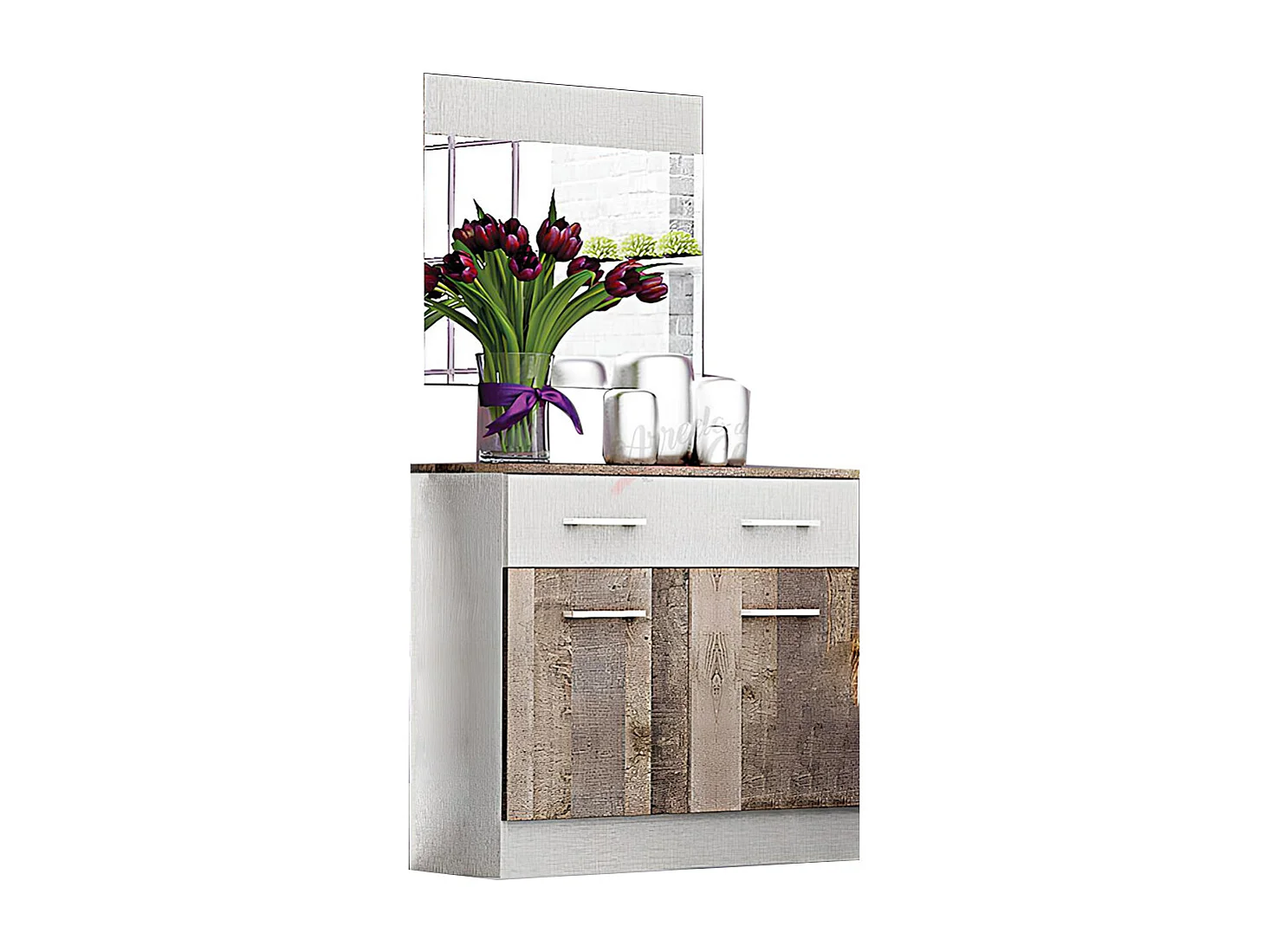 Comò da camera da letto con specchio e un'anta 100x81 quercia dorata e cemento CU38