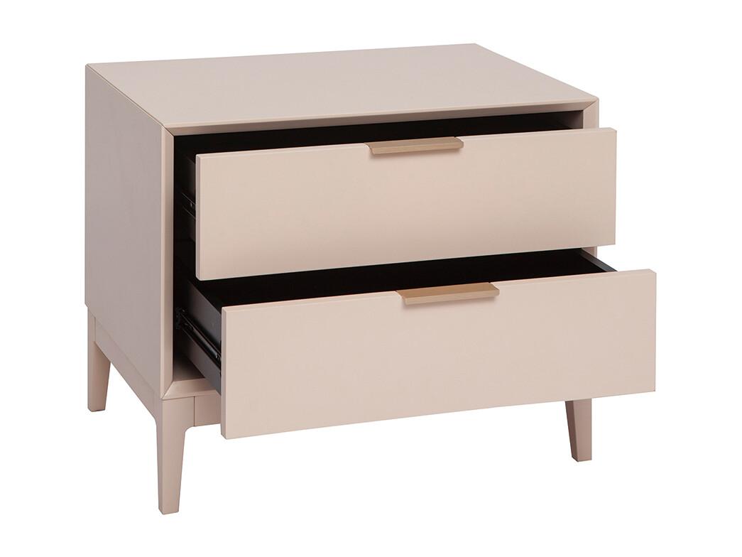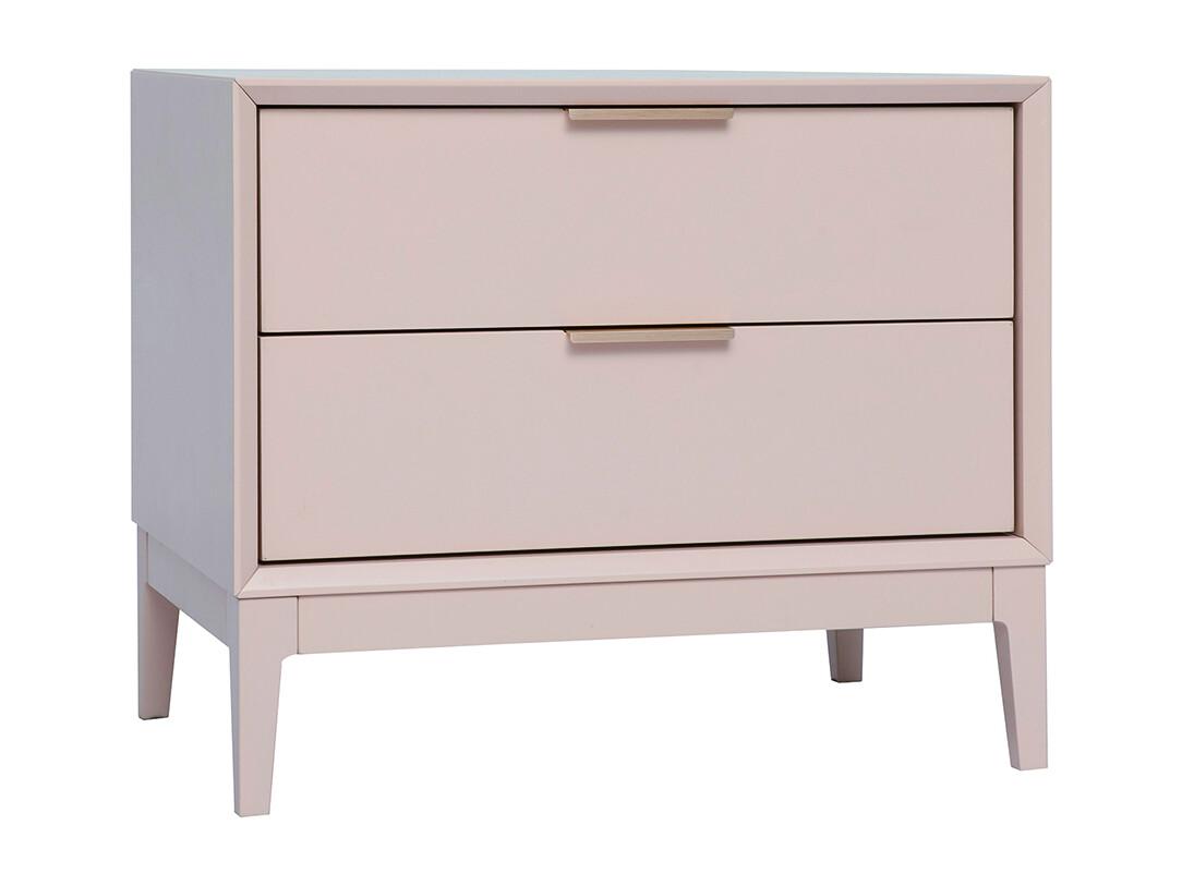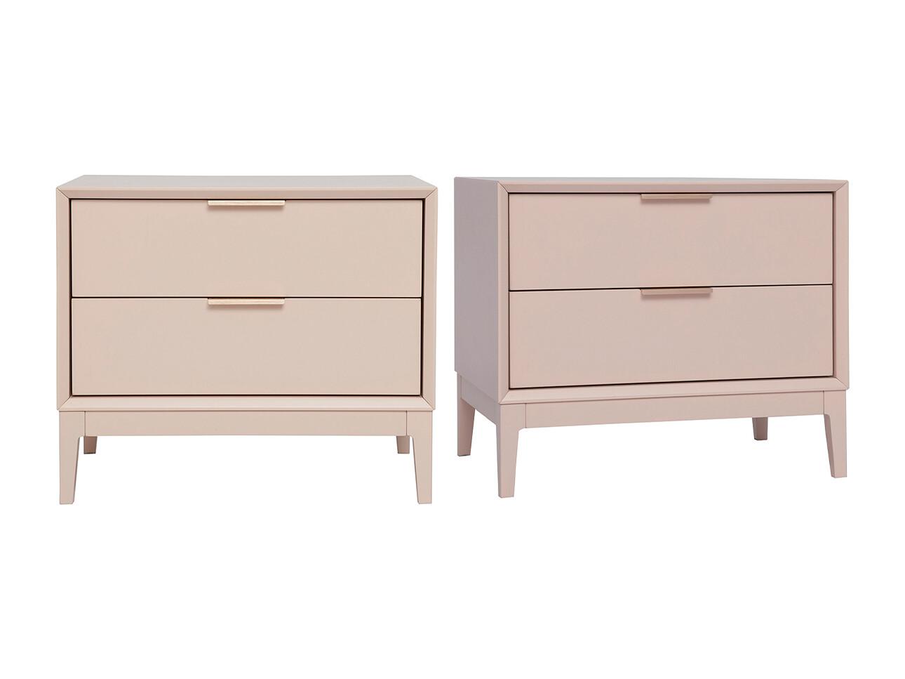 Armoniosi e delicati, questi comodini design offrono un elegante contrasto tra il dettaglio delle maniglie in metallo dorato e il rilassante rosa della struttura in pannelli di fibra di legno melaminico.