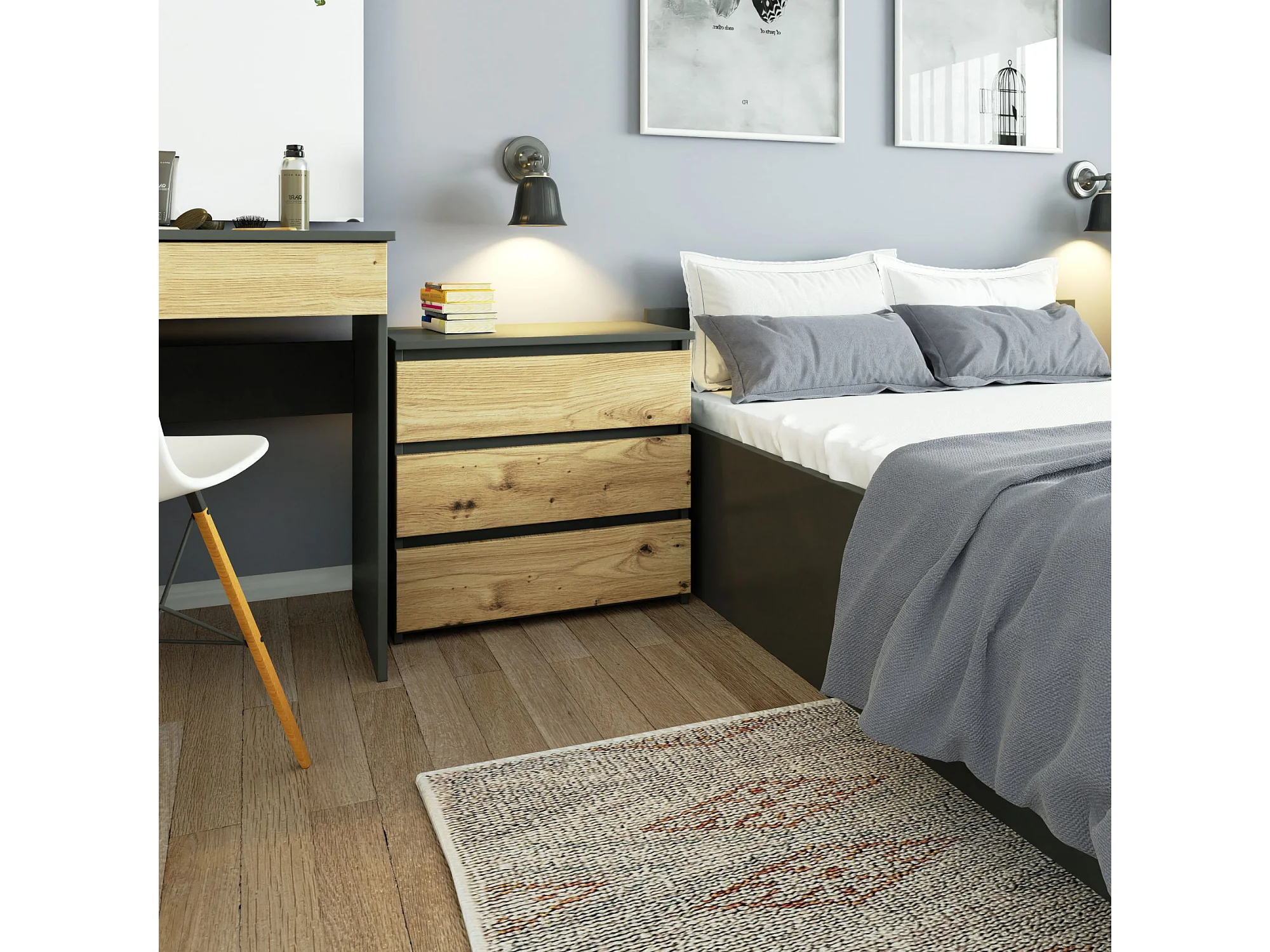 Comodino AKORD CL3 Grigia Grafite 60 cm 3 cassetti inserto frontale Quercia Artisan 60x35x57 cm