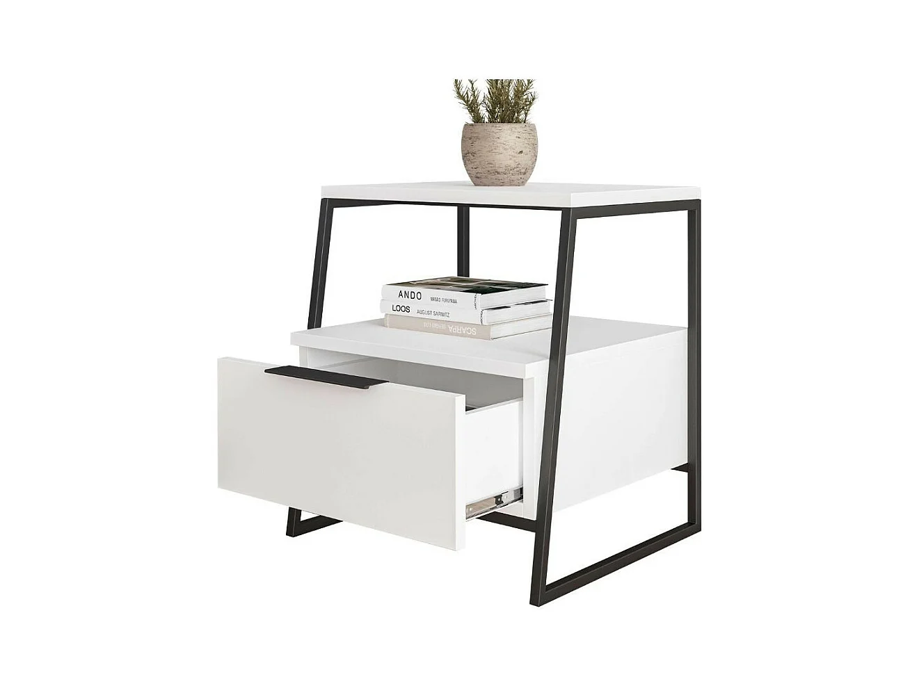 Comodino Sirius bianco con cassetto e gamba in metallo nero sinistro