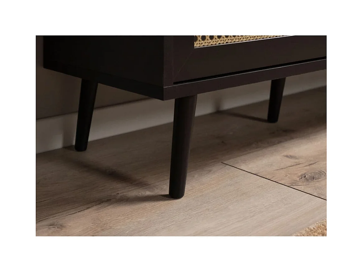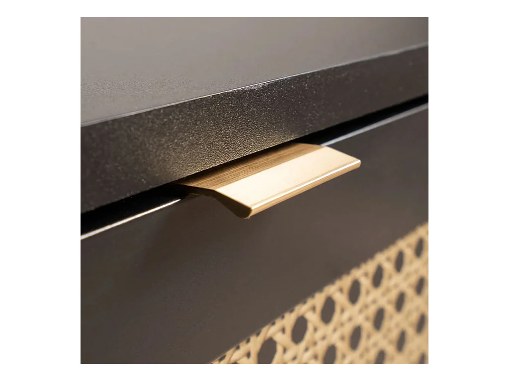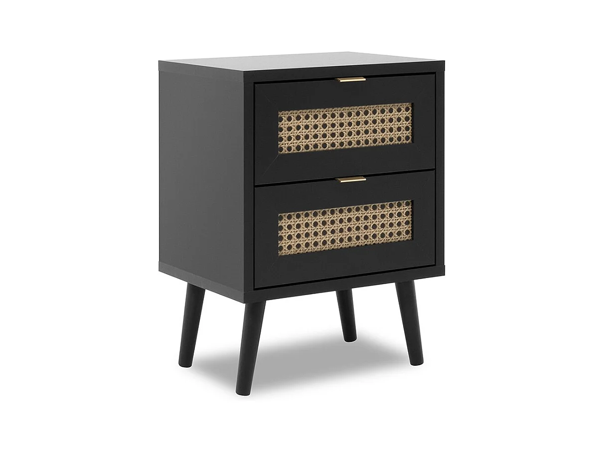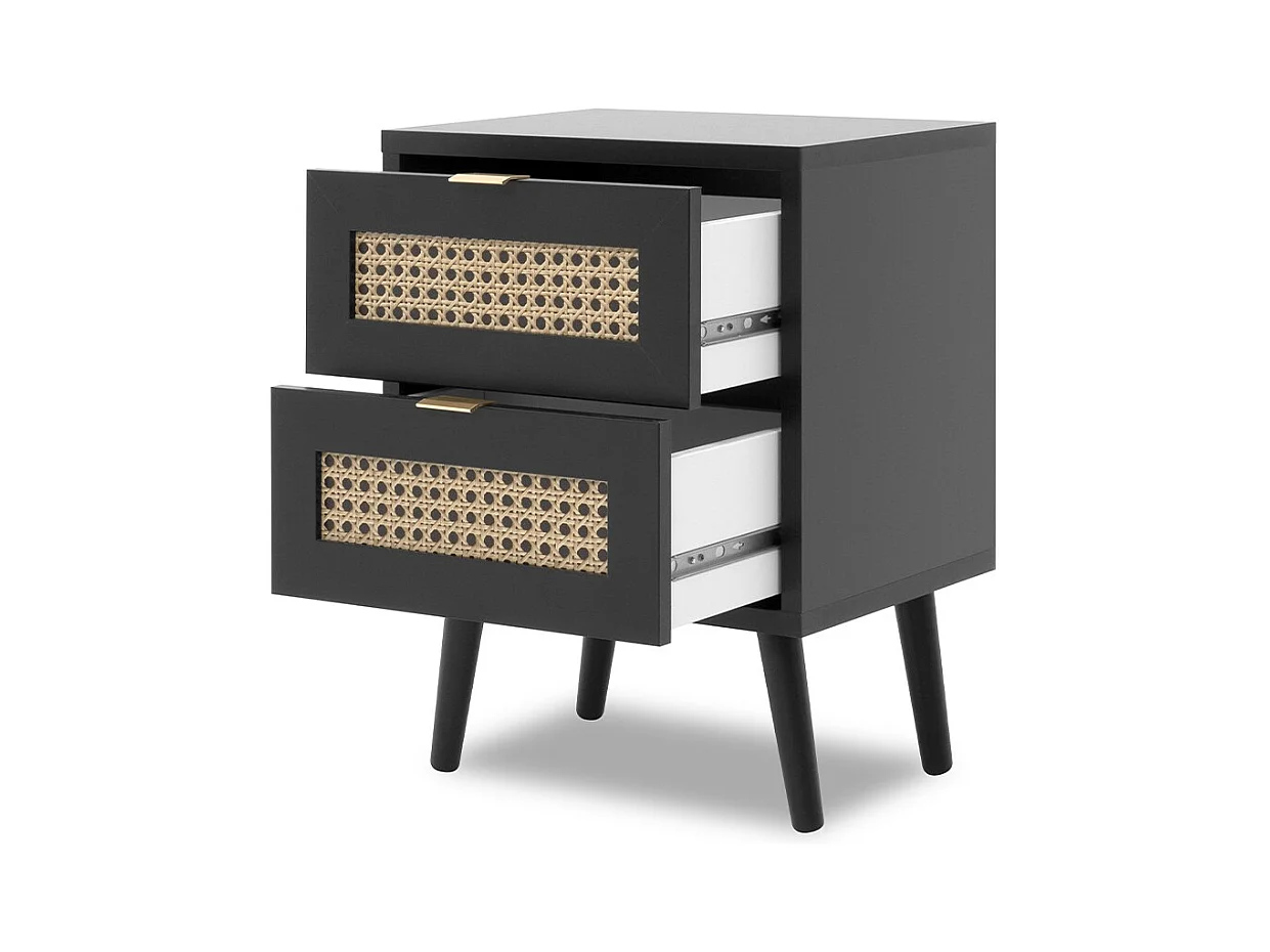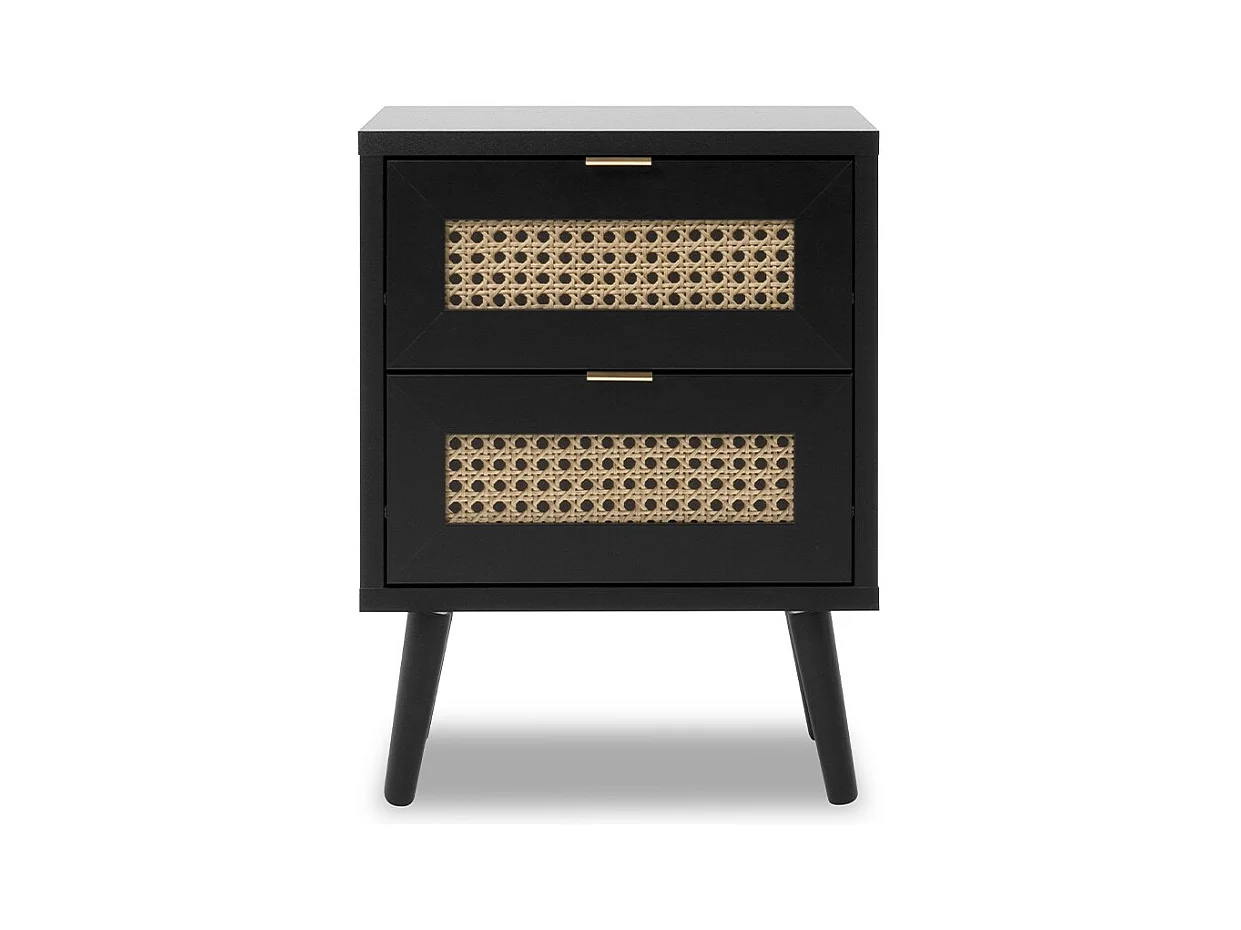Adrian Comodino Nero in Legno Massello di Pino e Rattan Naturale