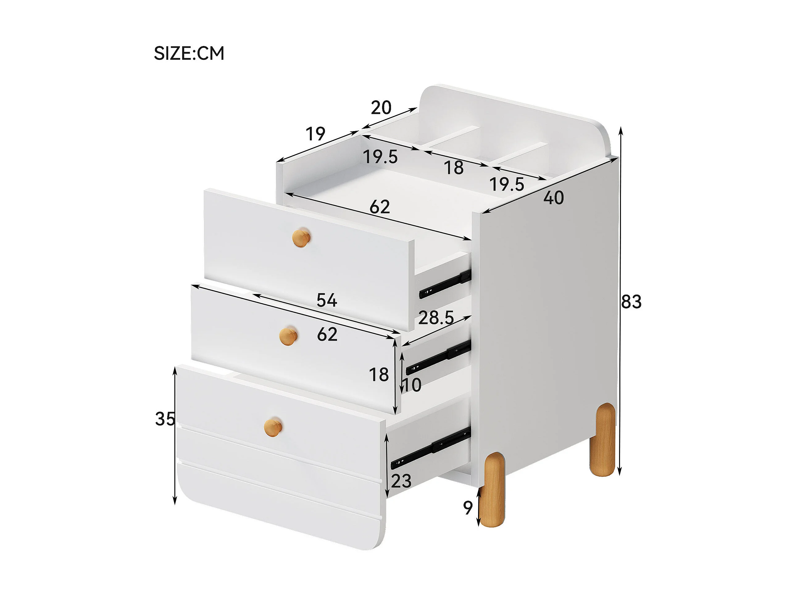 Comodino con 3 cassetti e gambe in legno - Bianco