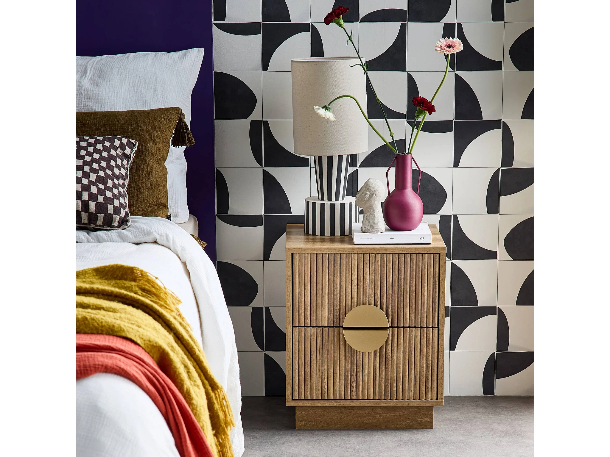 Comodino effetto legno di mango scanalato a 2 cassetti, celian