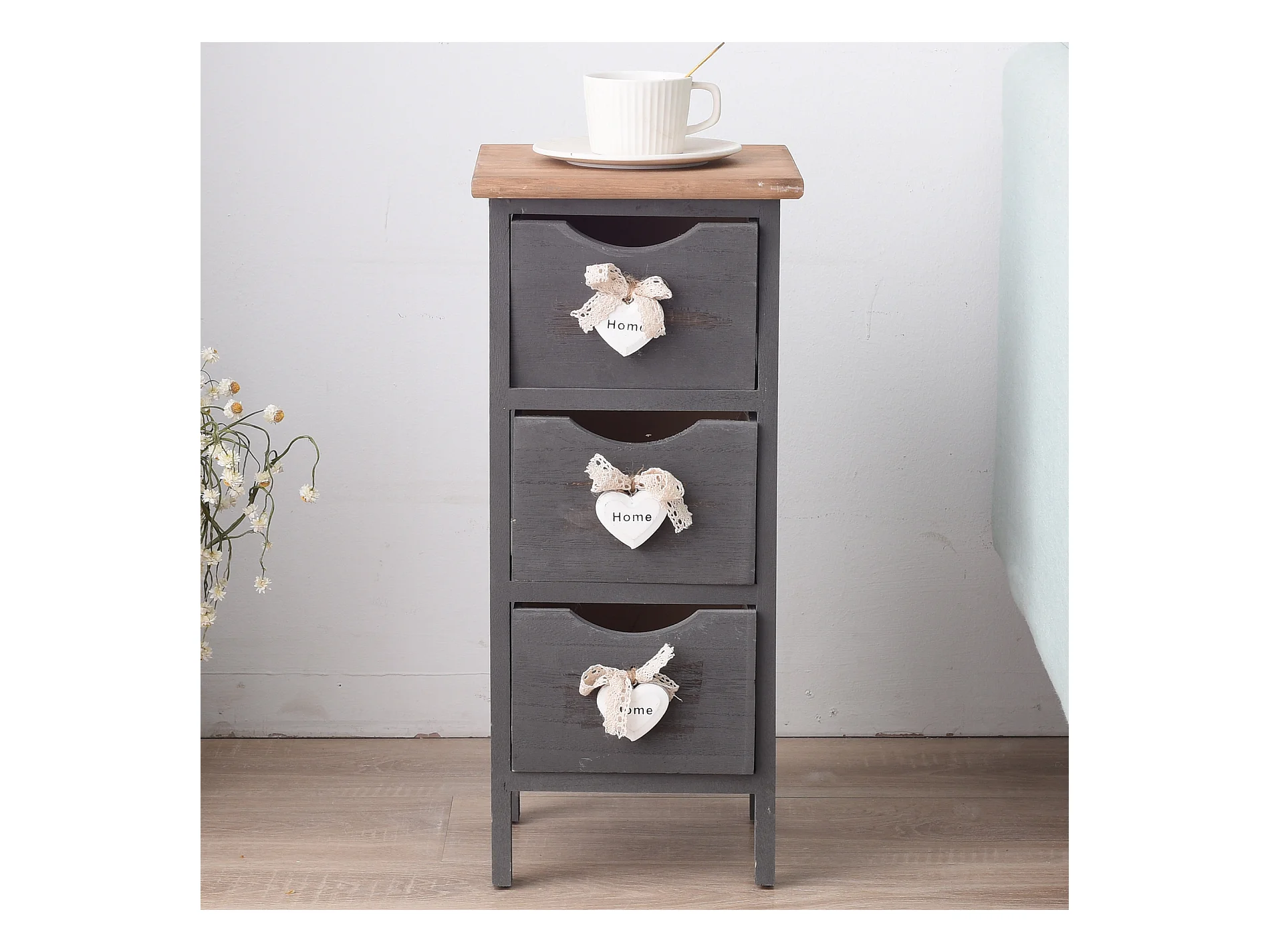 Comodino Cassettiera 3 Cassetti Legno Grigio Shabby 54x35x27