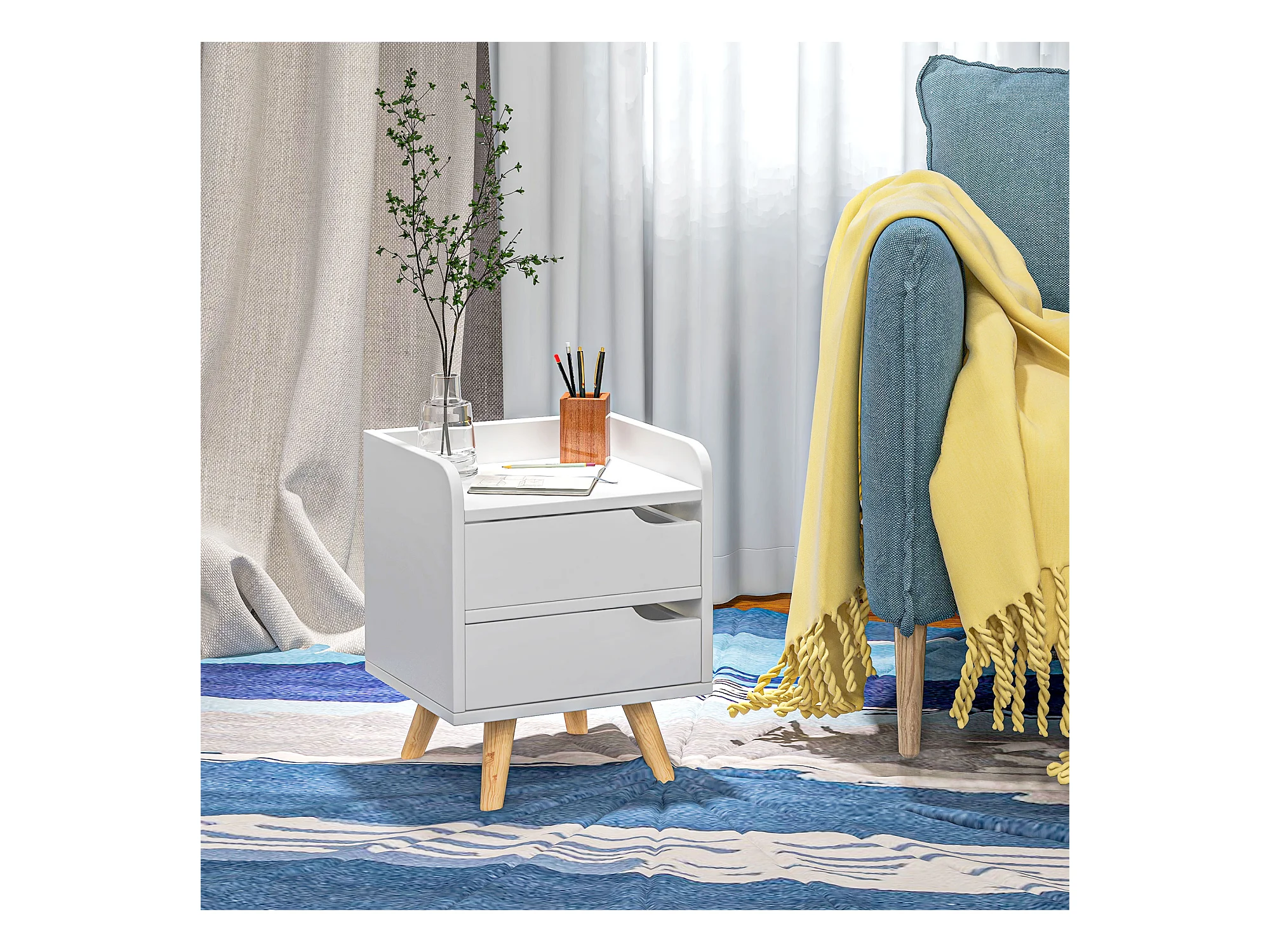 Comodino moderno con 2 cassetti e piedini in legno bianco
