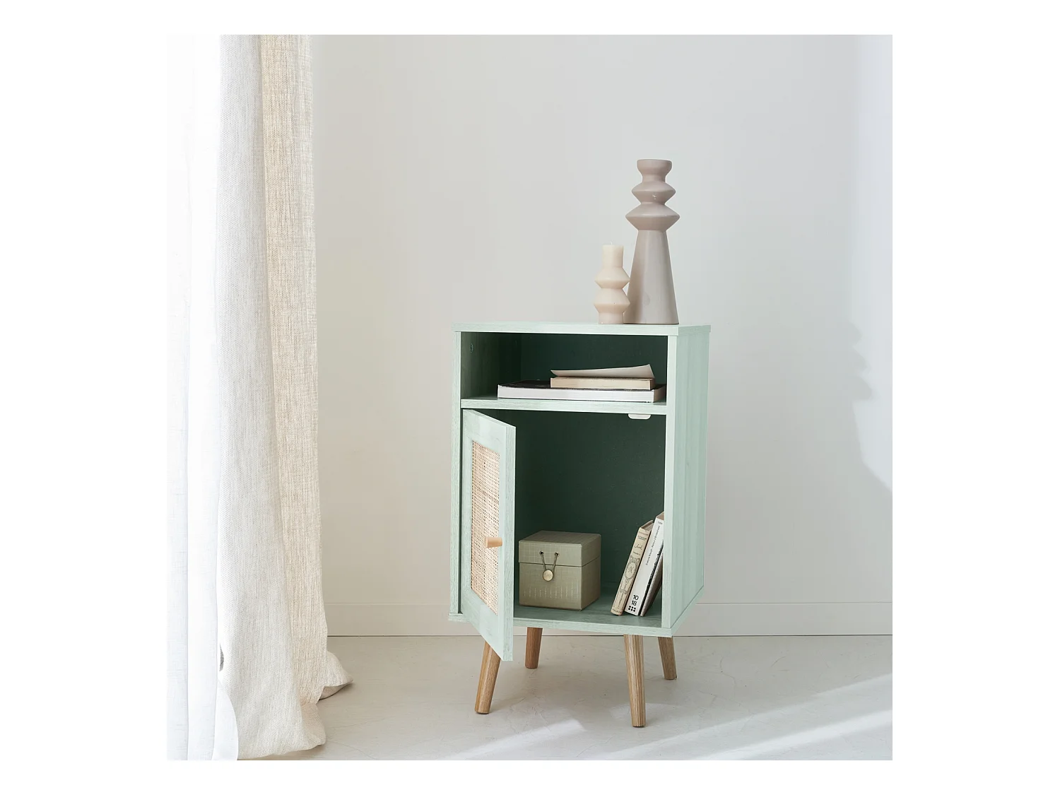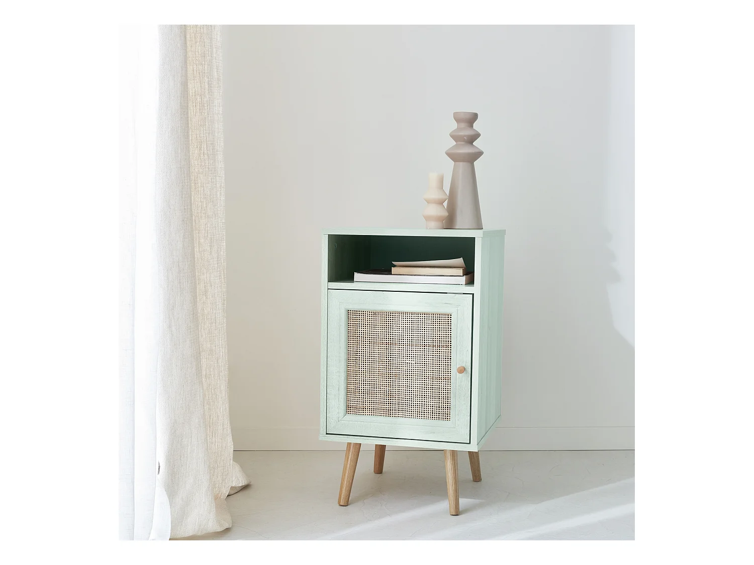 Comodino, set da 2, tavolino laterale, blu navy, motivo a squame di pesce, frontale in rattan, gambe in metallo (H50/L35/P35 cm)