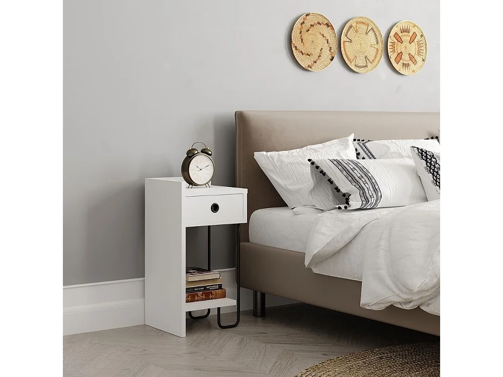 Comodino Sirius bianco con cassetto e gamba in metallo nero sinistro