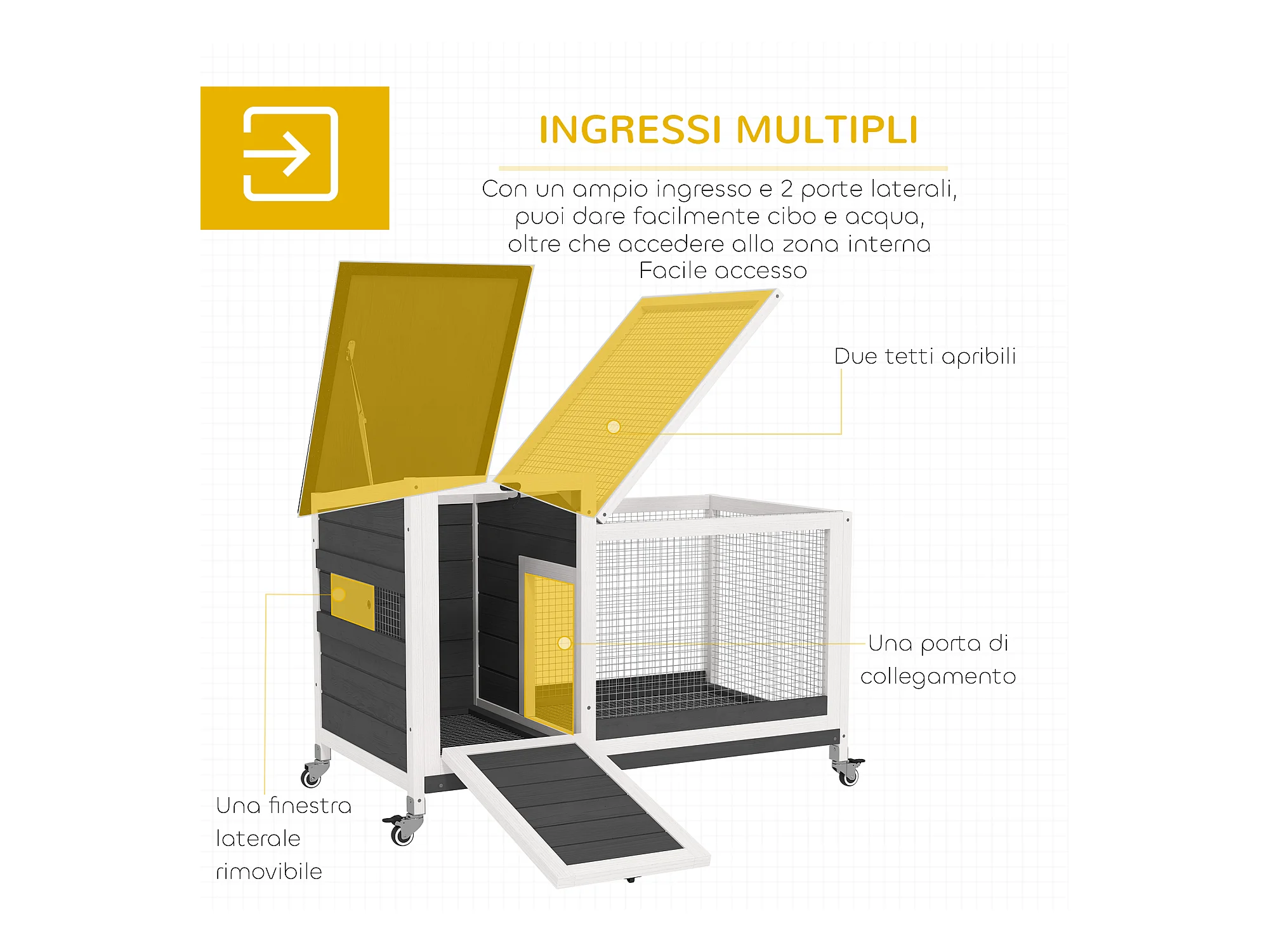 Gabbia per conigli con tetto in asfalto e rampa di accesso antiscivolo