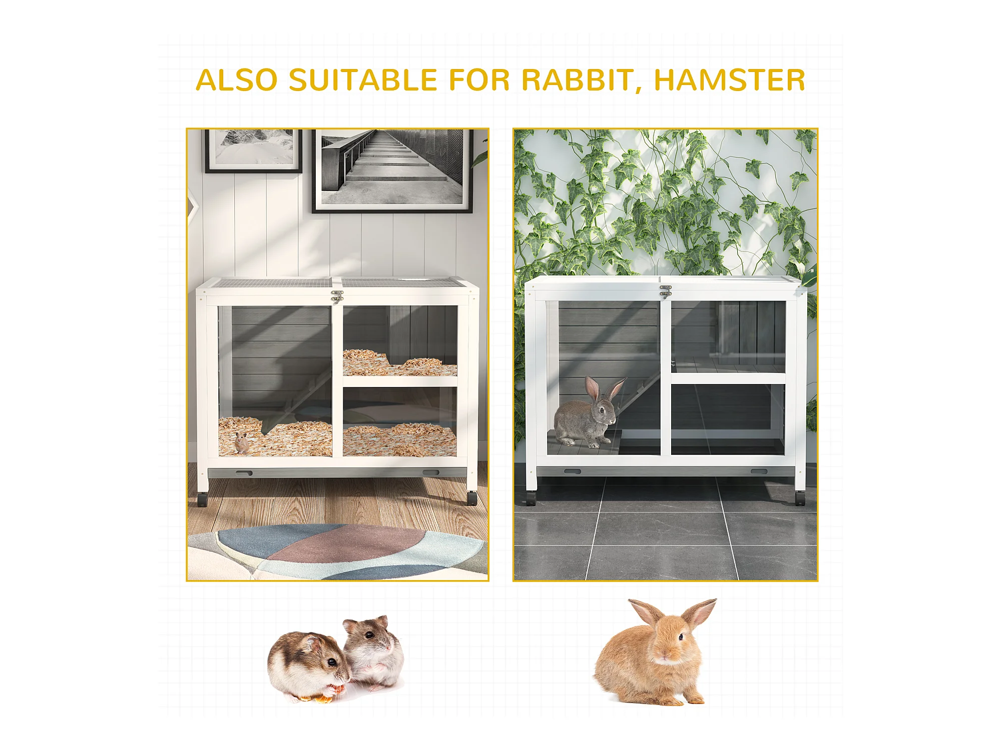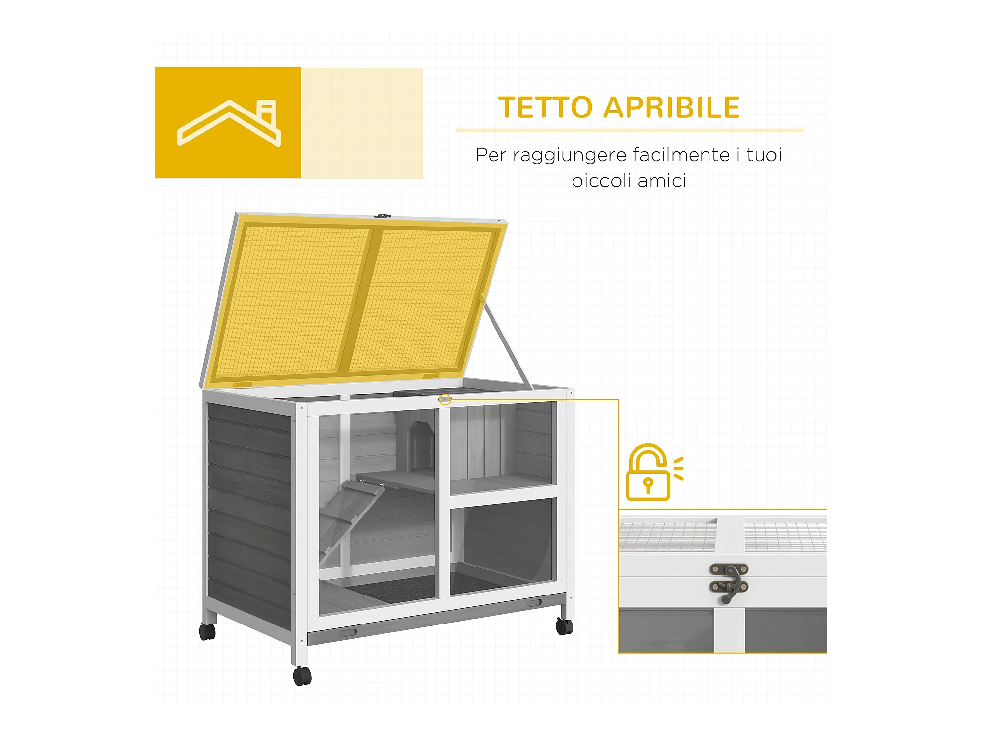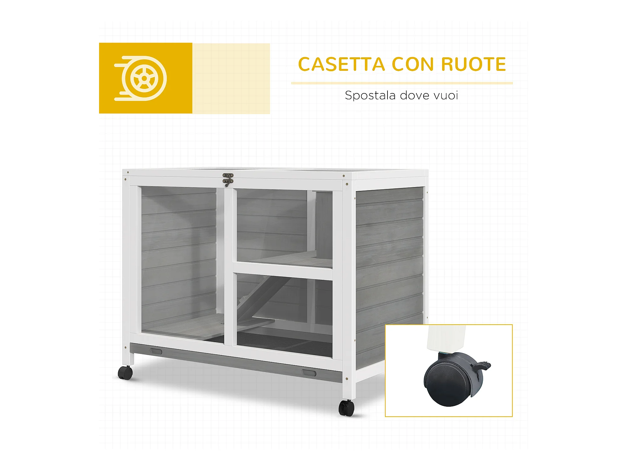 Gabbia per conigli e porcellini d'india, 4 ruote, casetta e rampa, legno