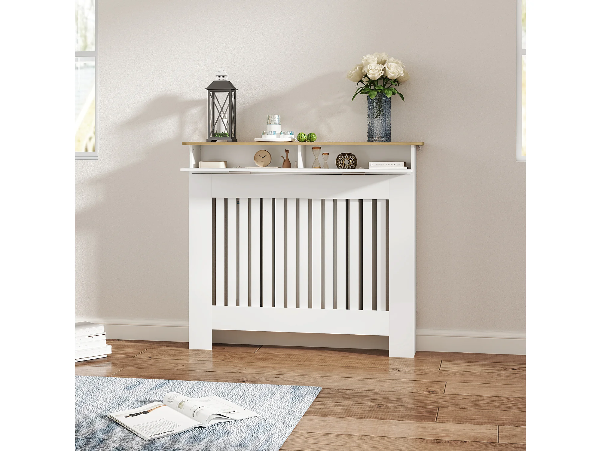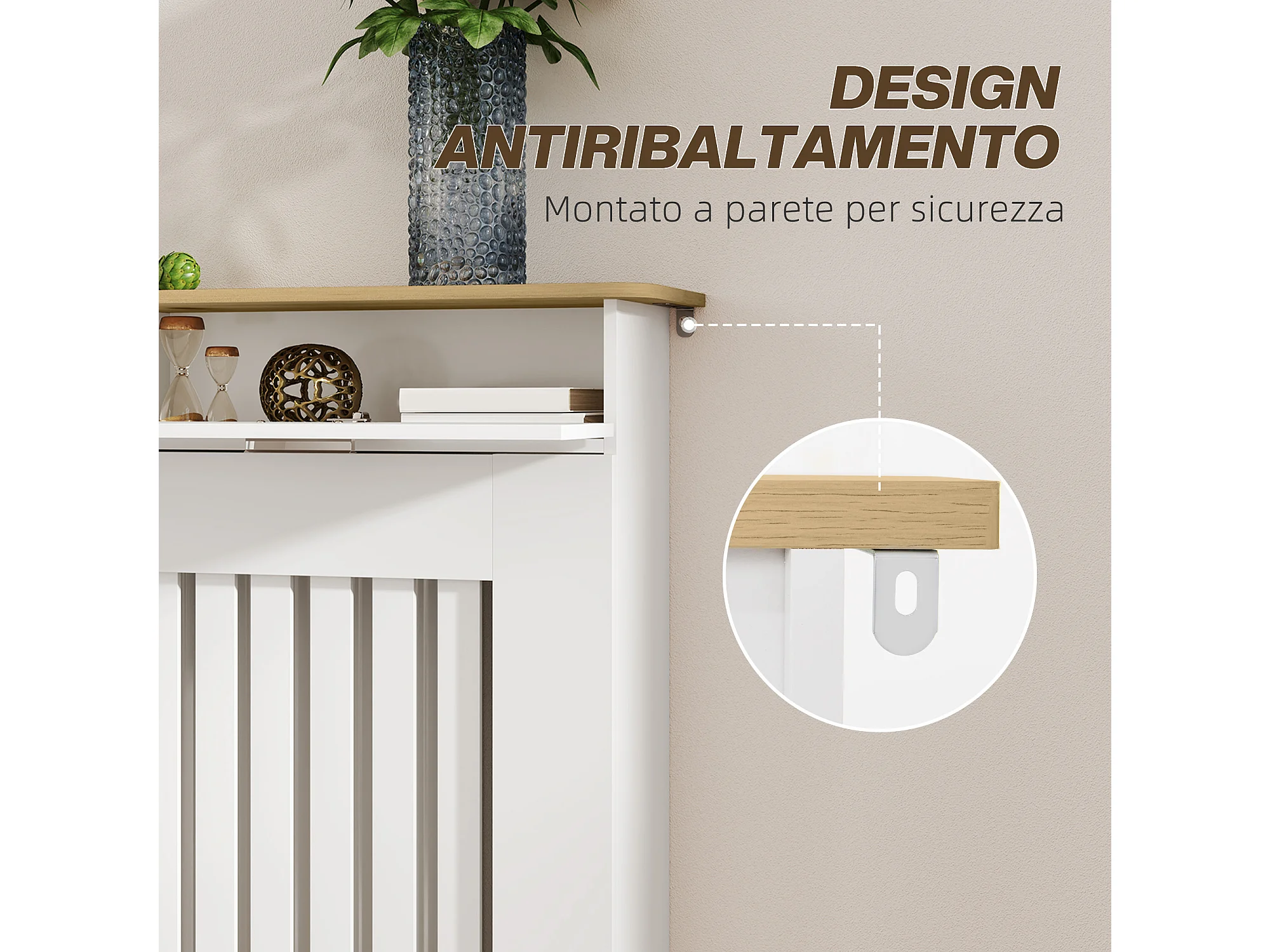 Copritermosifone a doghe per la casa in mdf e acciaio bianco