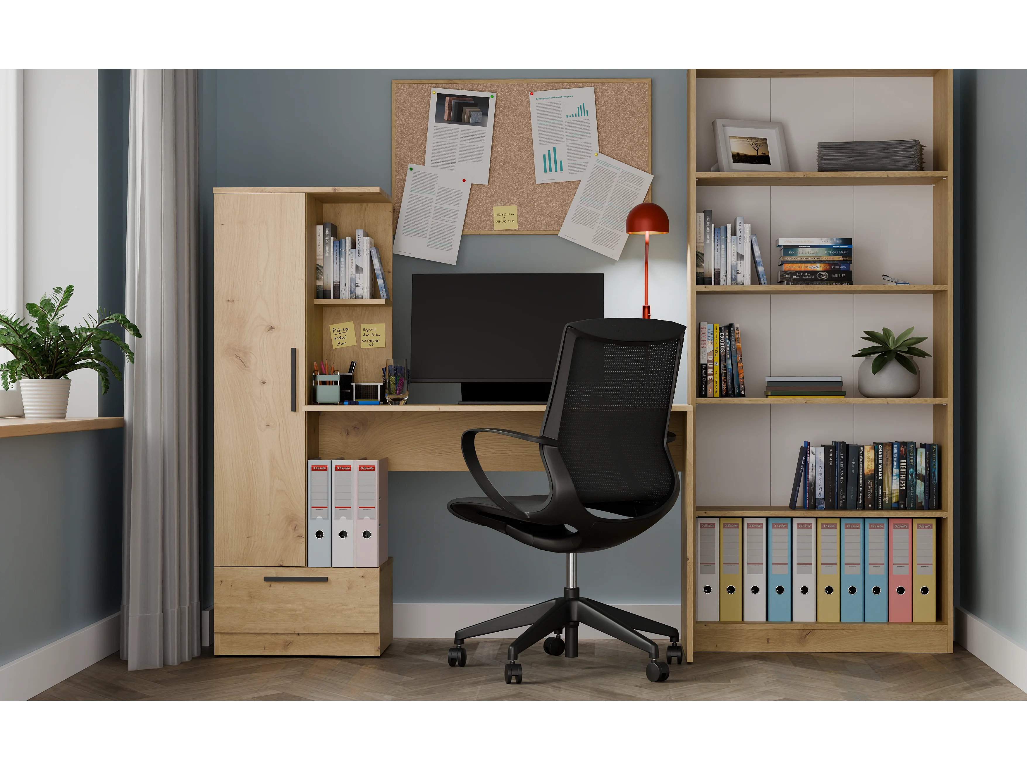 COSMO - Scrivania rovere artigianale con 6 scaffali, 1 cassetto e 1 anta