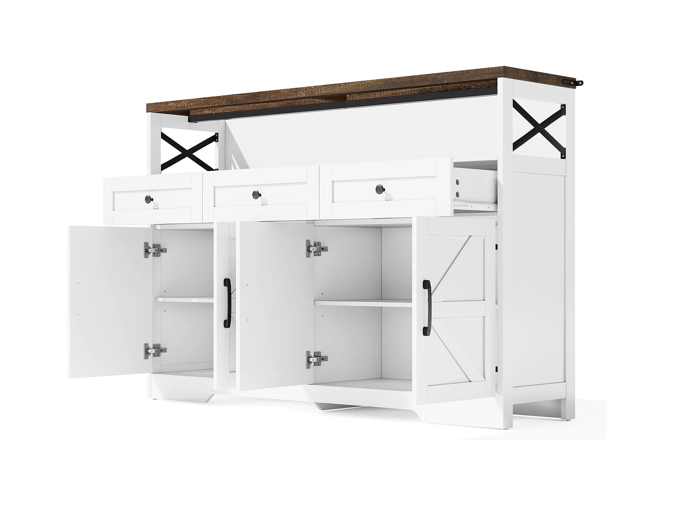 Credenza 140x35x95cm con 3 cassetti, 4 ante e 1 nicchia, piano in legno effetto marrone, corpo bianco