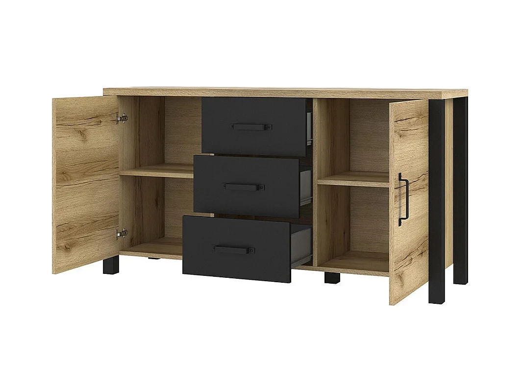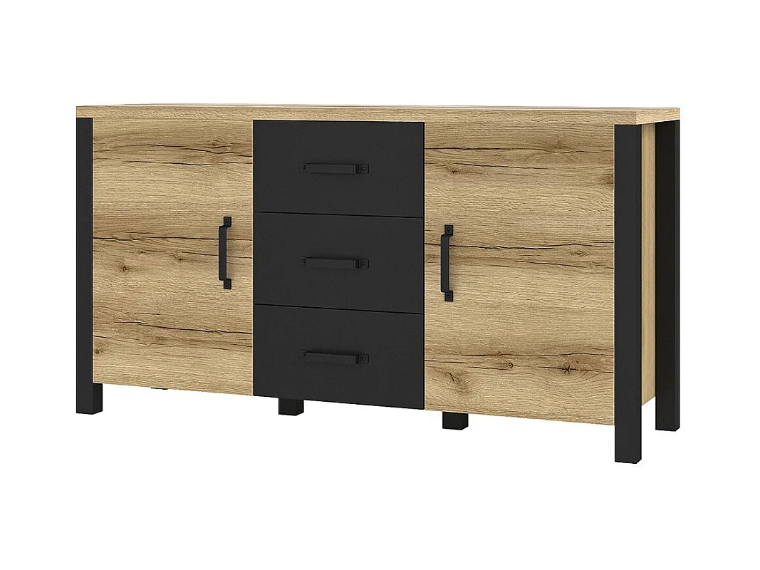 Credenza 150cm collezione DARWIN. Colore rovere chiaro e nero. 2 porte e 3 cassetti.