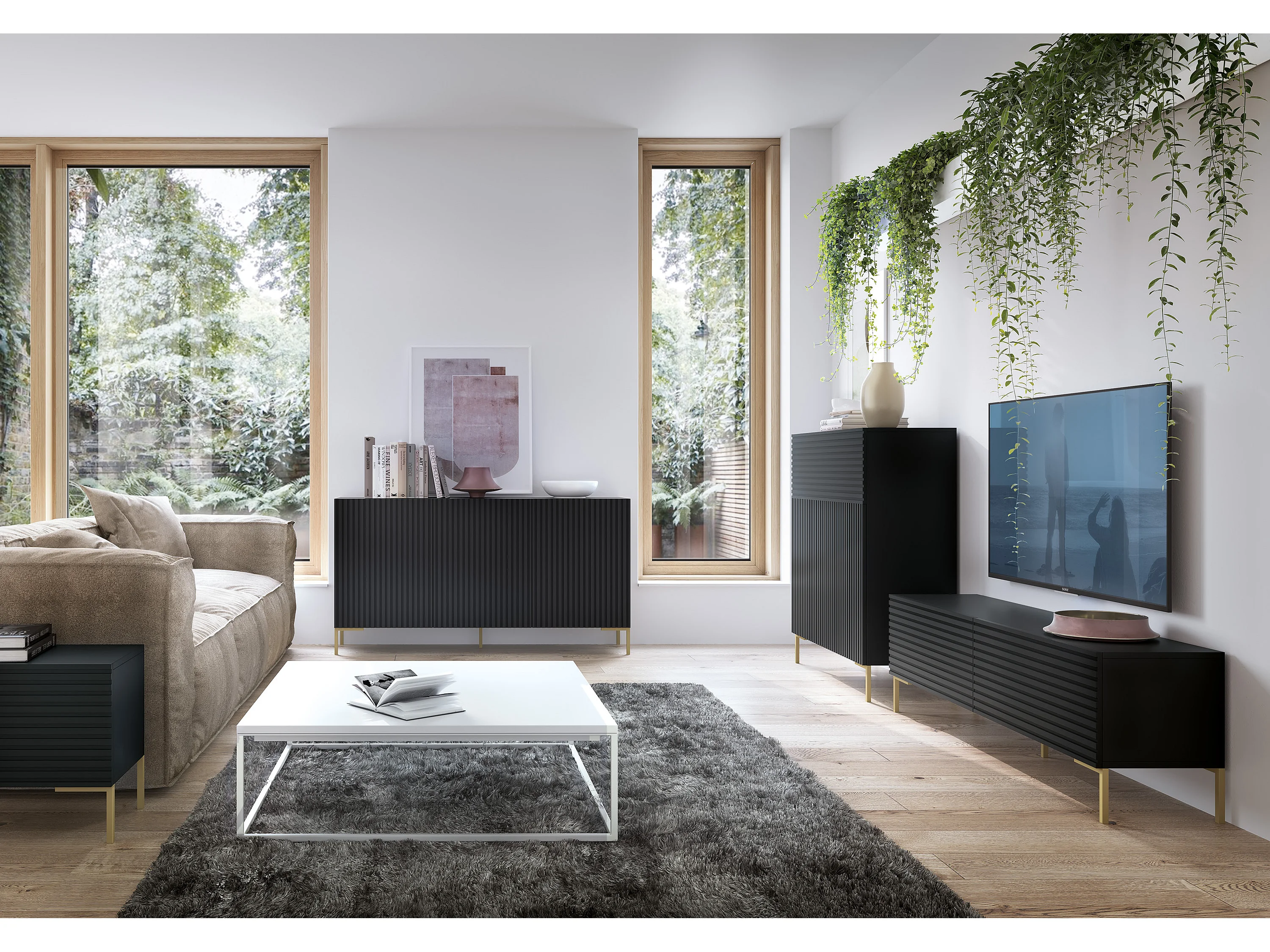 Credenza a 3 ante 140 cm con frontali a doghe, nera - Lammelo