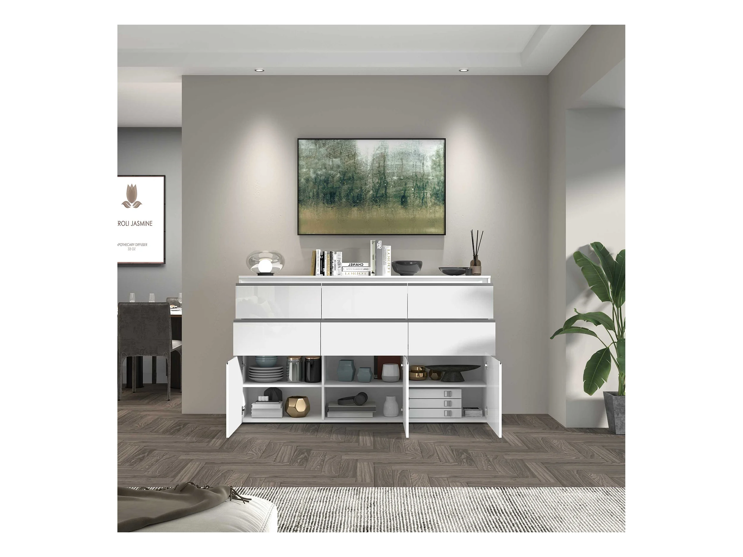 Credenza a cassettiera Magic 2 ante e 4 cassetti bianco lucido 120x40x105 cm
