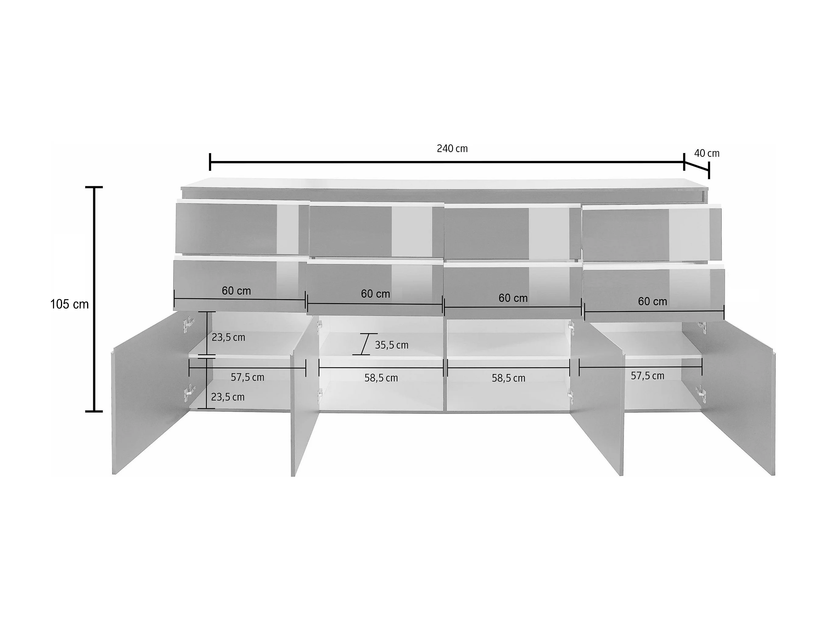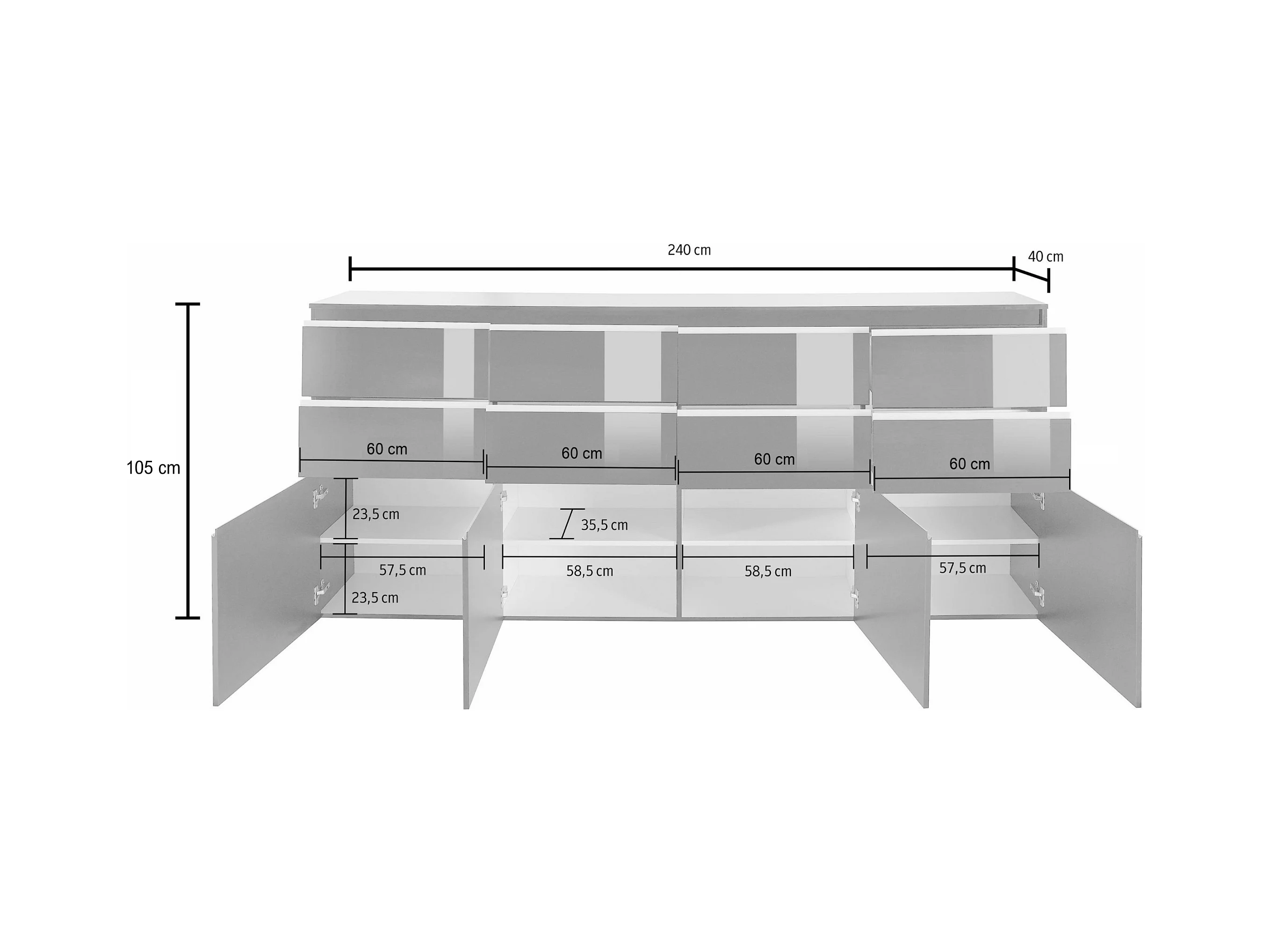 Credenza a cassettiera Magic 4 ante e 8 cassetti bianco lucido 240x40x105 cm