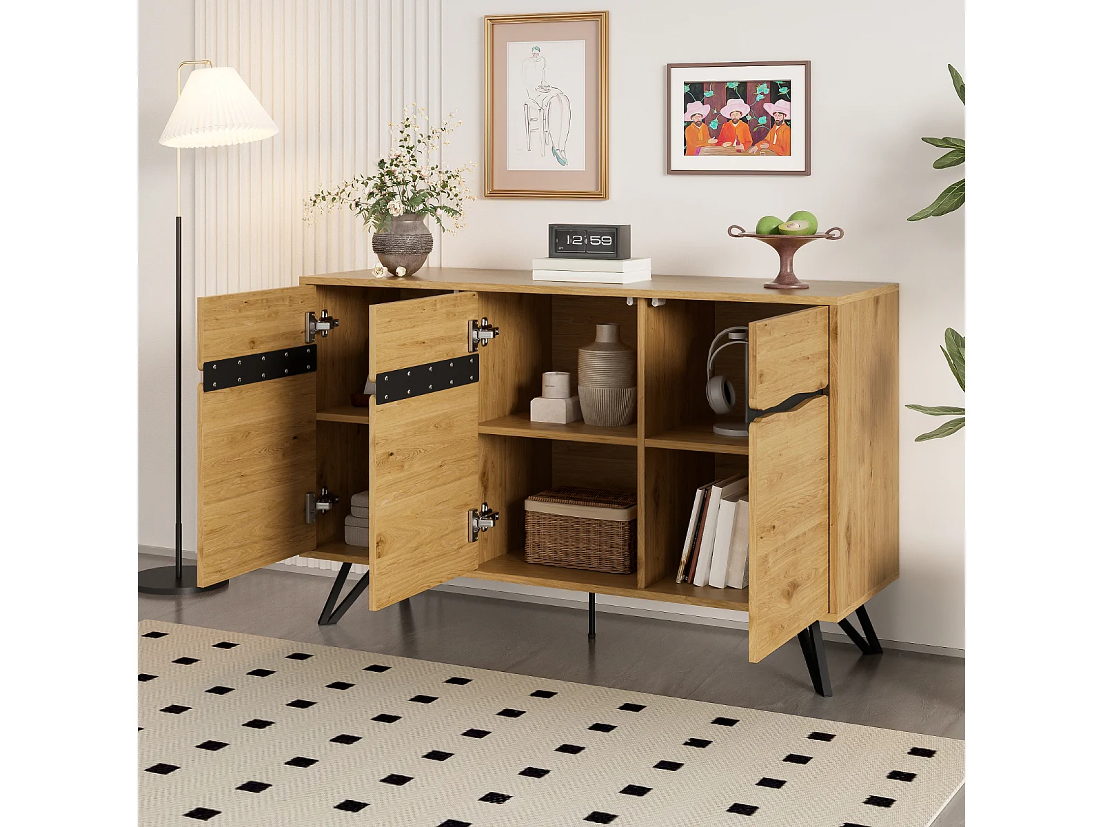 Credenza a quattro ante con gambe in metallo dorato, in legno naturale, 140 x 75 x 38 cm, per cucina o soggiorno