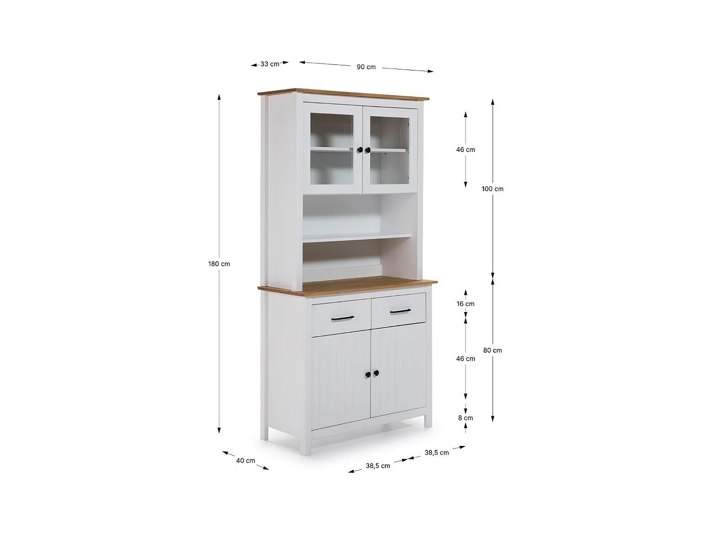 Credenza alta con vetrina Miranda in legno massiccio colore bianco e rovere 90x40x180H - 4 ante e 2 cassetti